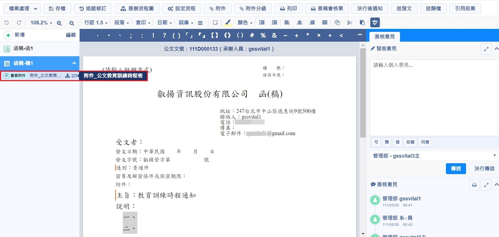 2. 只有「函附件」會跟著公文發出去,會簽附件並不會。(稿附件在公文稿轉文後會變成函附件)