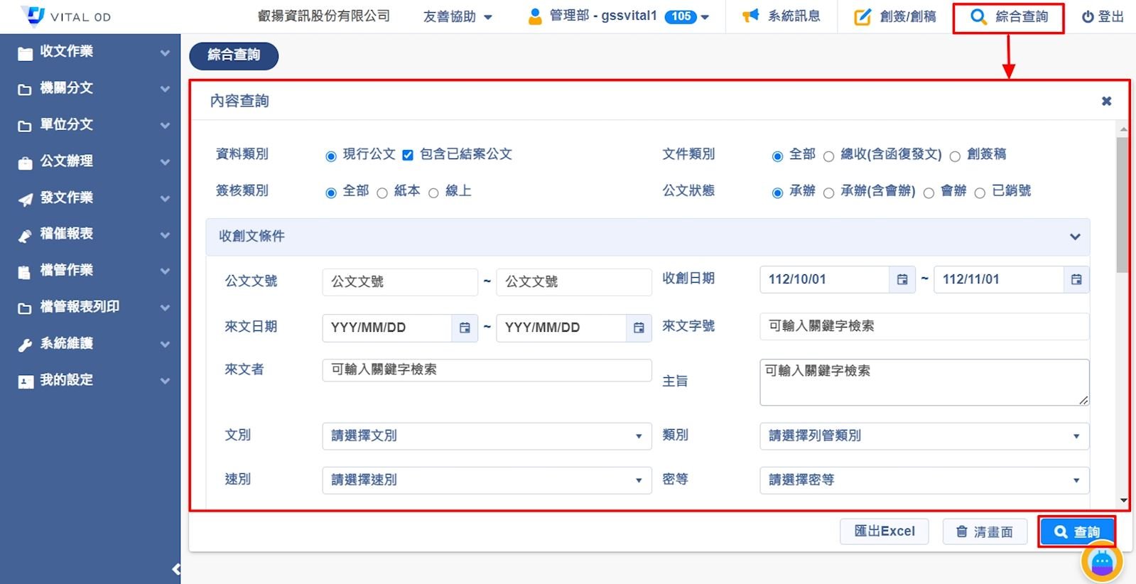 1. 進入『綜合查詢』, 下查詢條件,查出欲列印的公文