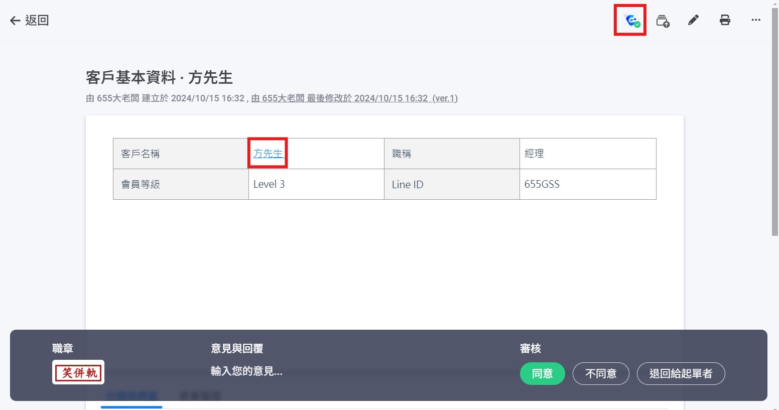 送出表單後可點擊右上方CRM圖示,系統會將表單資料匯入 CRM,當客戶名稱變藍色即可點擊連結至 CRM 客戶資料,查看由 BizForm 匯入的擴充欄位資料。