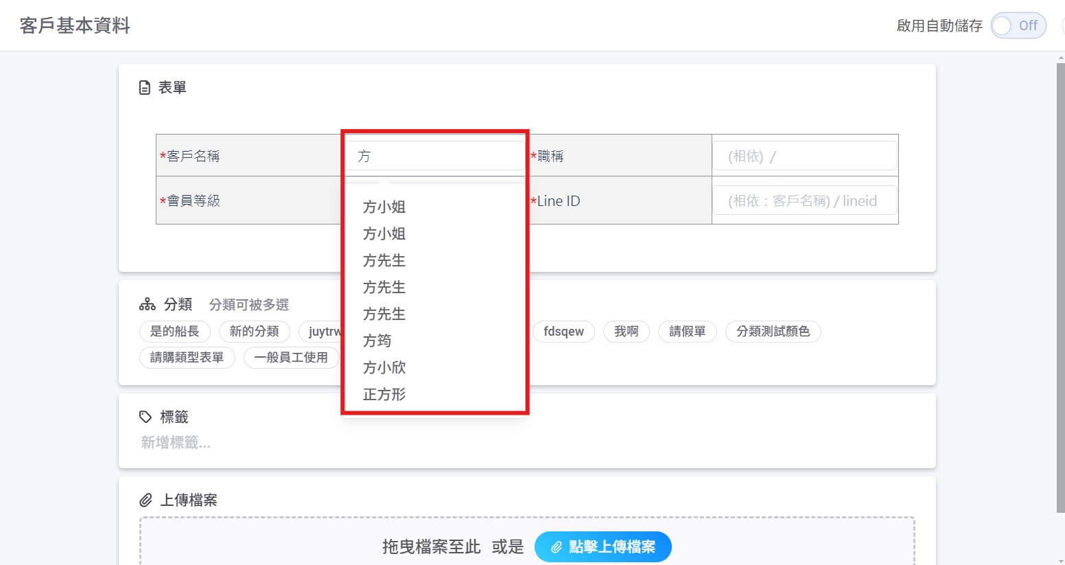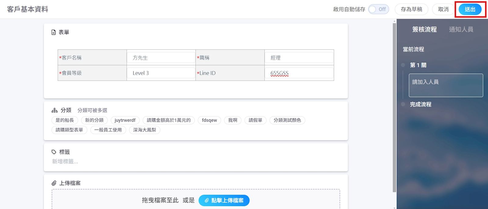 點擊主欄位 [客戶名稱] 輸入客戶名稱 (若是CRM既有客戶也可直接在下拉選單點選),並將其他欄位填寫完成後按右上方【送出】。