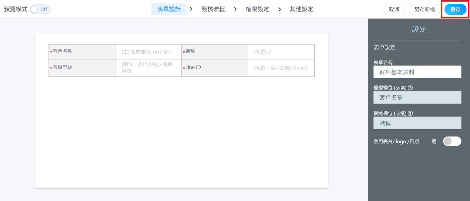 設定完所有欄位後,右上角按【儲存】就完成表單設計。