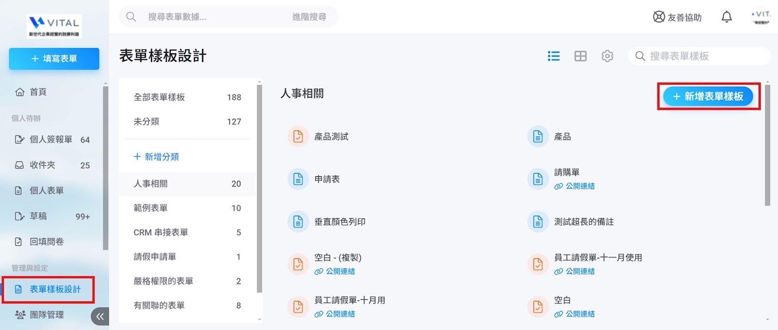 以客戶填寫基本資料表單為例,點選【表單樣板設計>新增表單樣板】創建一個客戶基本資料表。