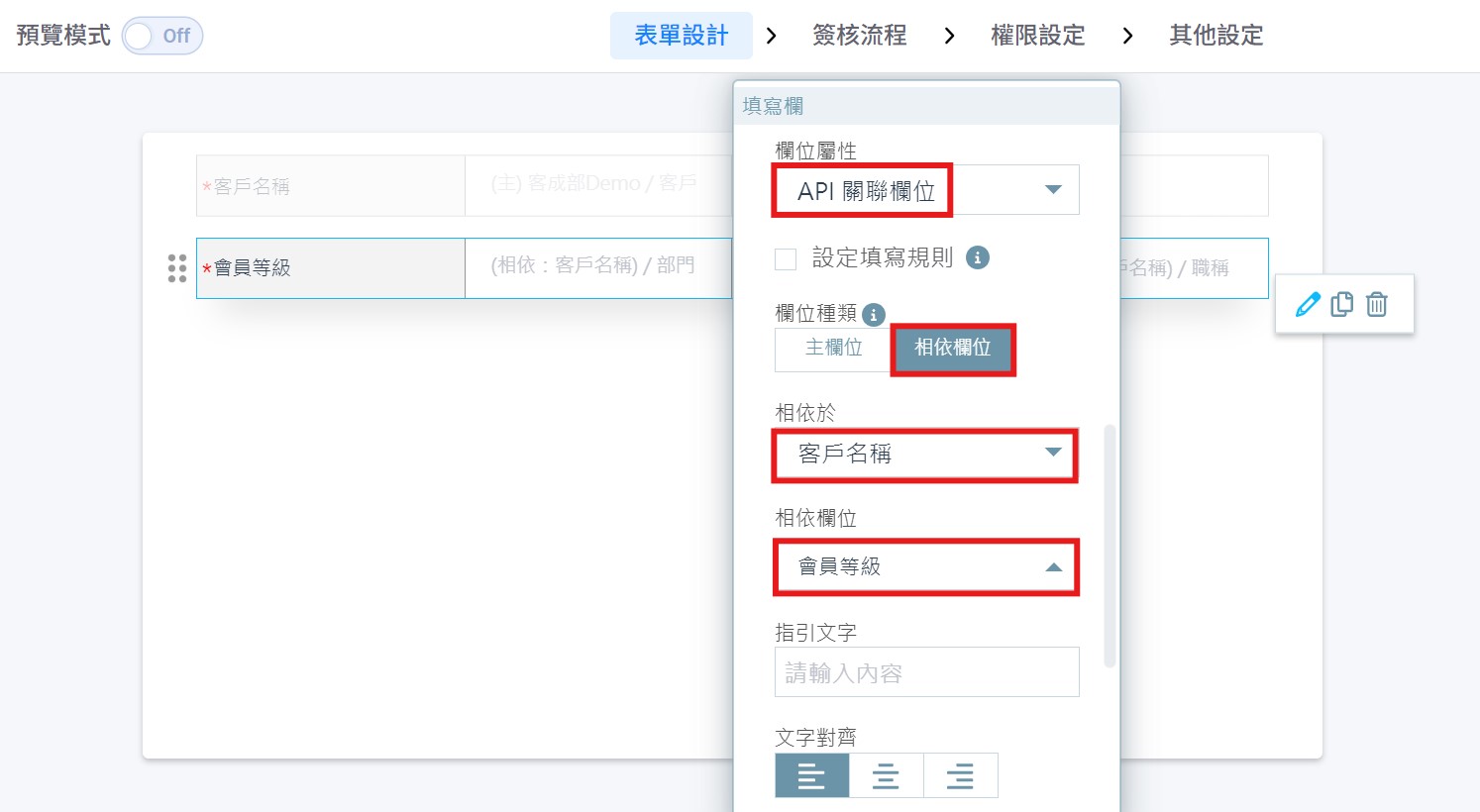 接著設定【相依欄位】,欄位屬性選擇【API 關聯欄位】,相依欄位下拉即可看到 CRM 擴充欄位。