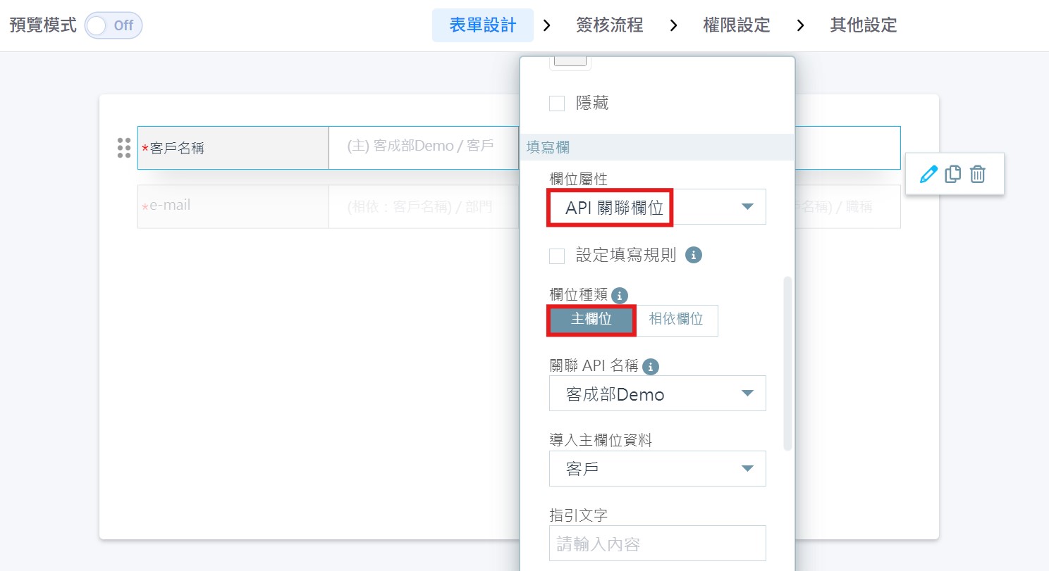 首先設定【主欄位】,欄位屬性選擇【API 關聯欄位】(關聯API是CRM站台名稱)