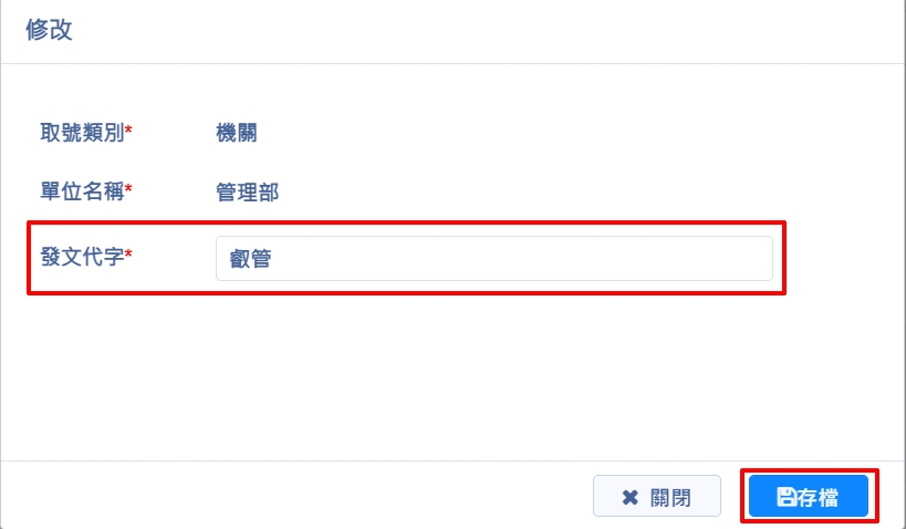 1.請在發文作業的「發文代字維護」中,點選【修改】
