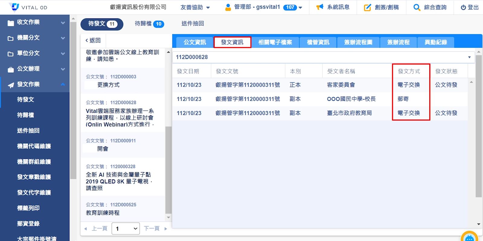 點選【發文資訊】的頁籤,檢查受文者的【發文方式】是否為【電子交換】