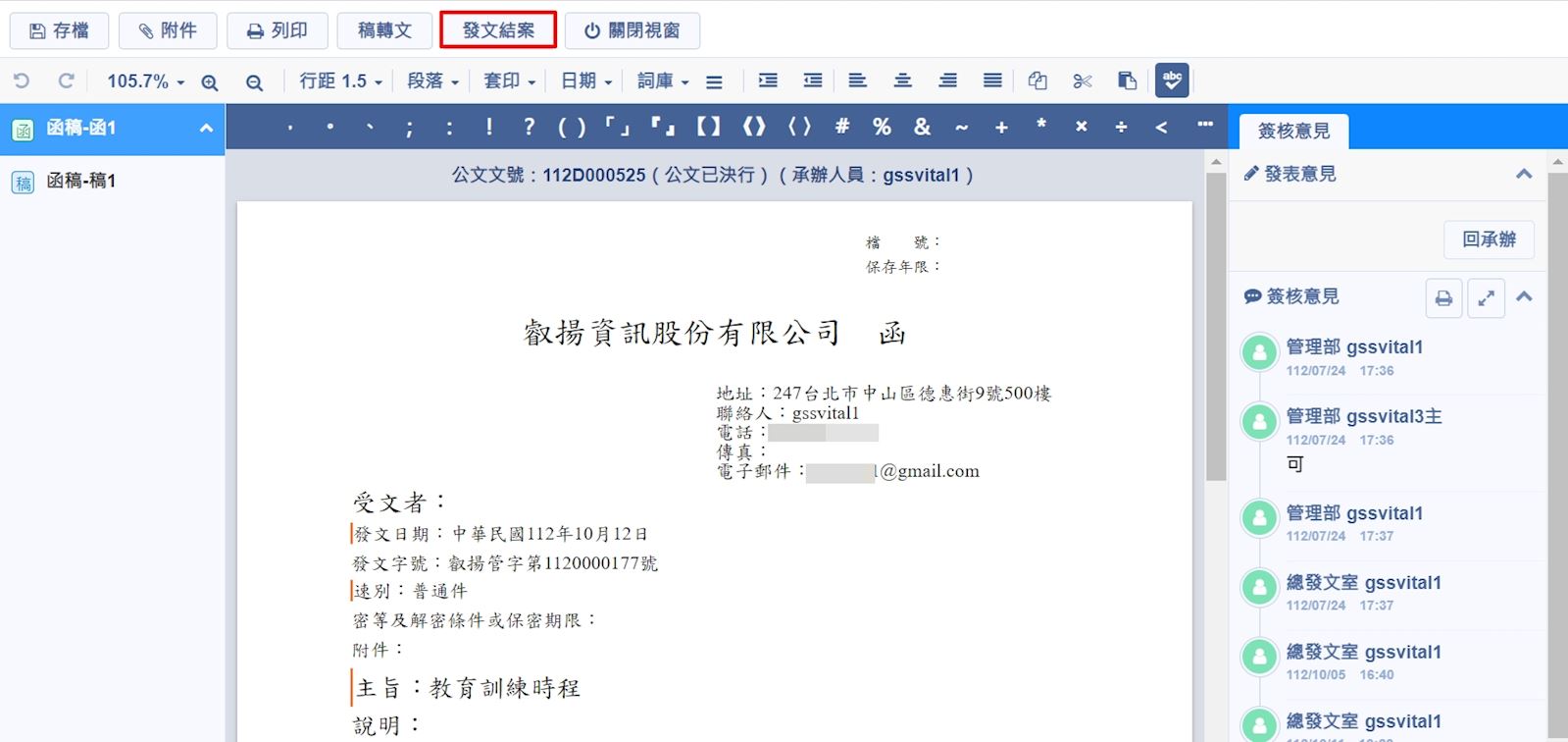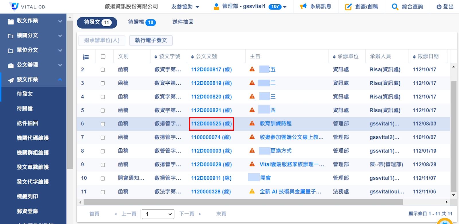找到您要發文的公文請點選【公文文號】進入公文畫面