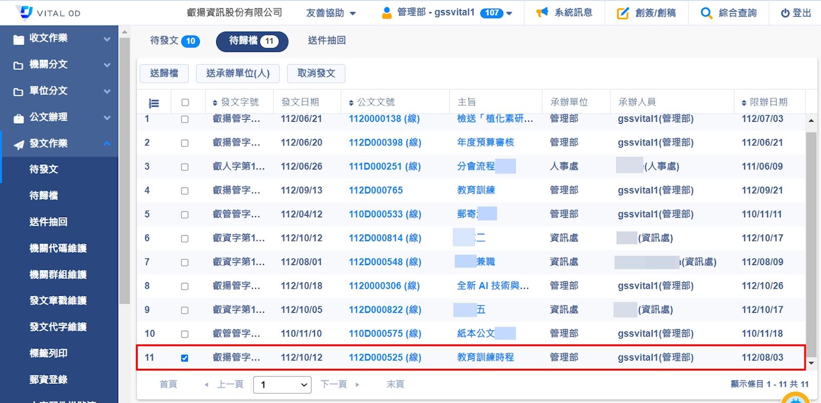如果公文已經發文結案,則該份公文會在【待歸檔】區裡即可進行歸檔。