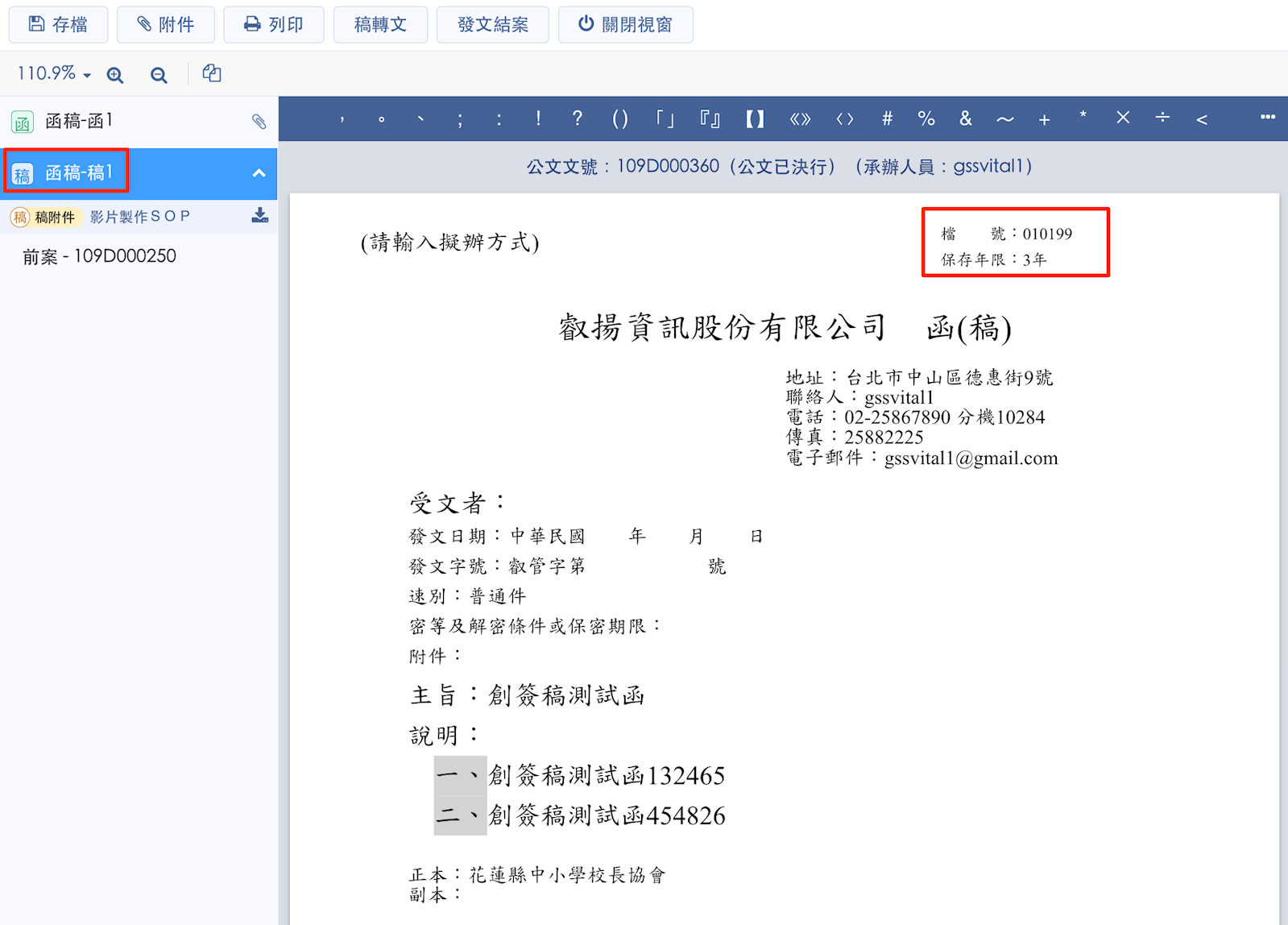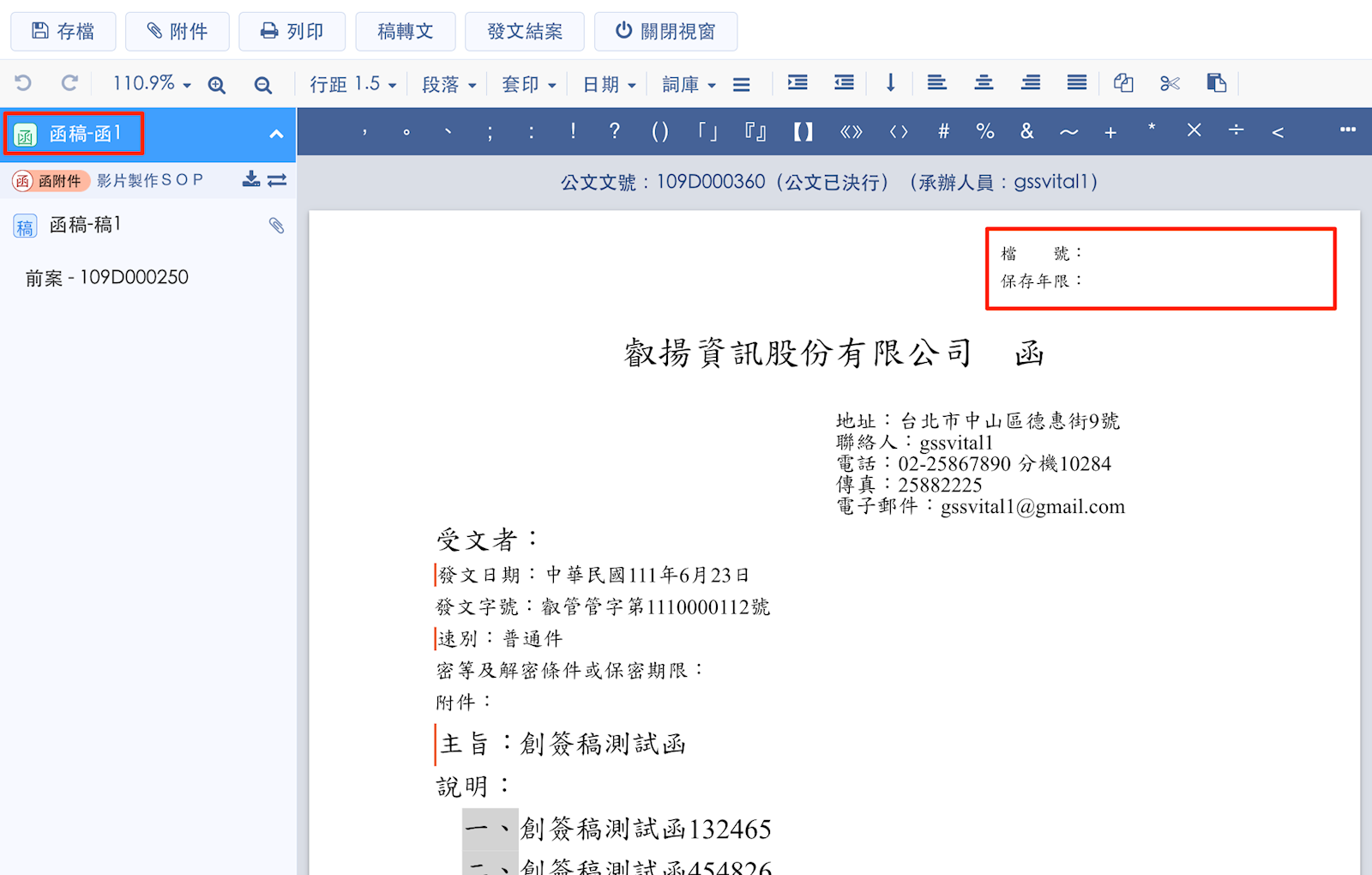 稿上的檔號是機關內部自己在看的,函是要正式發出去的公文,所以不會把機關內部在看的檔號顯示上去。