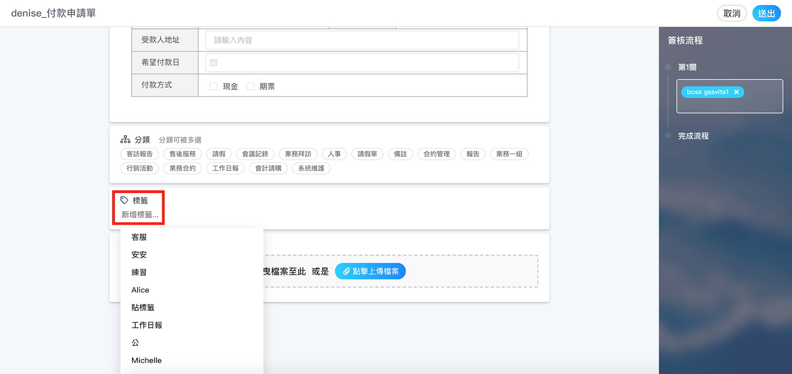 若您在填寫表單的時候要貼上標籤,您可以在下方標籤欄點選【新增標籤】在下拉選單中選擇;或是用直接輸入的方式新增標籤,輸入完畢後按Enter即可新增標籤。