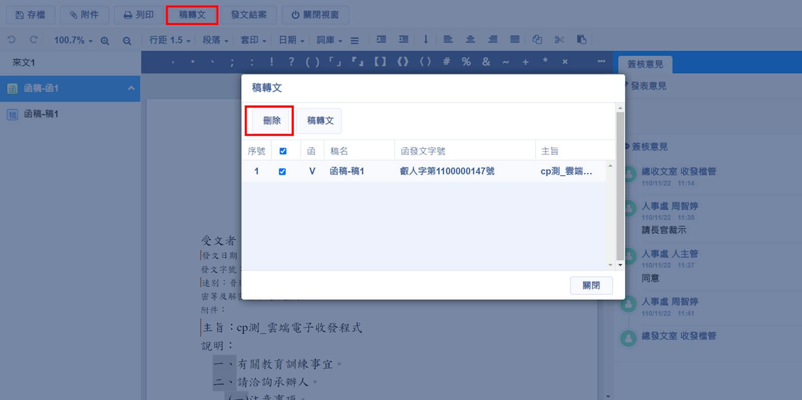 *註:發文人員點開文號系統會自動稿轉函,退文後避免同仁不是改在稿,而是改到函,所以退文前建議先用【稿轉文】功能刪掉函後再退。如果退文前忘記刪除函直接退承辦人,承辦人無法刪除函,所以要提醒承辦人員把公文改在稿。