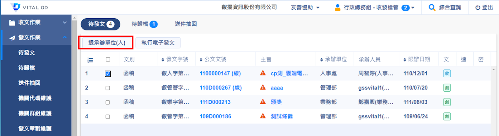 請發文人員在【待發文】中勾選該公文,點選【退承辦單位(人)】。