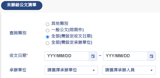 1. 請至「 未辦結公文清單」點選「全部(需設定收文日期)」,並輸入收文日期,僅可查詢一個月內的區間