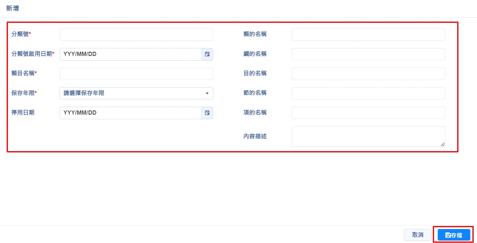 3. 若是要新增分類號,進入『分類號維護』後點選【新增】,輸入分類號資料後點選【存檔】,存檔後,系統會自動新增一個「總案」的案次號
