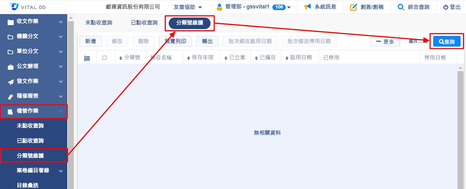 1. 進入『檔管作業』/『分類號維護』,若要修改分類號,下查詢條件後點選【查詢】