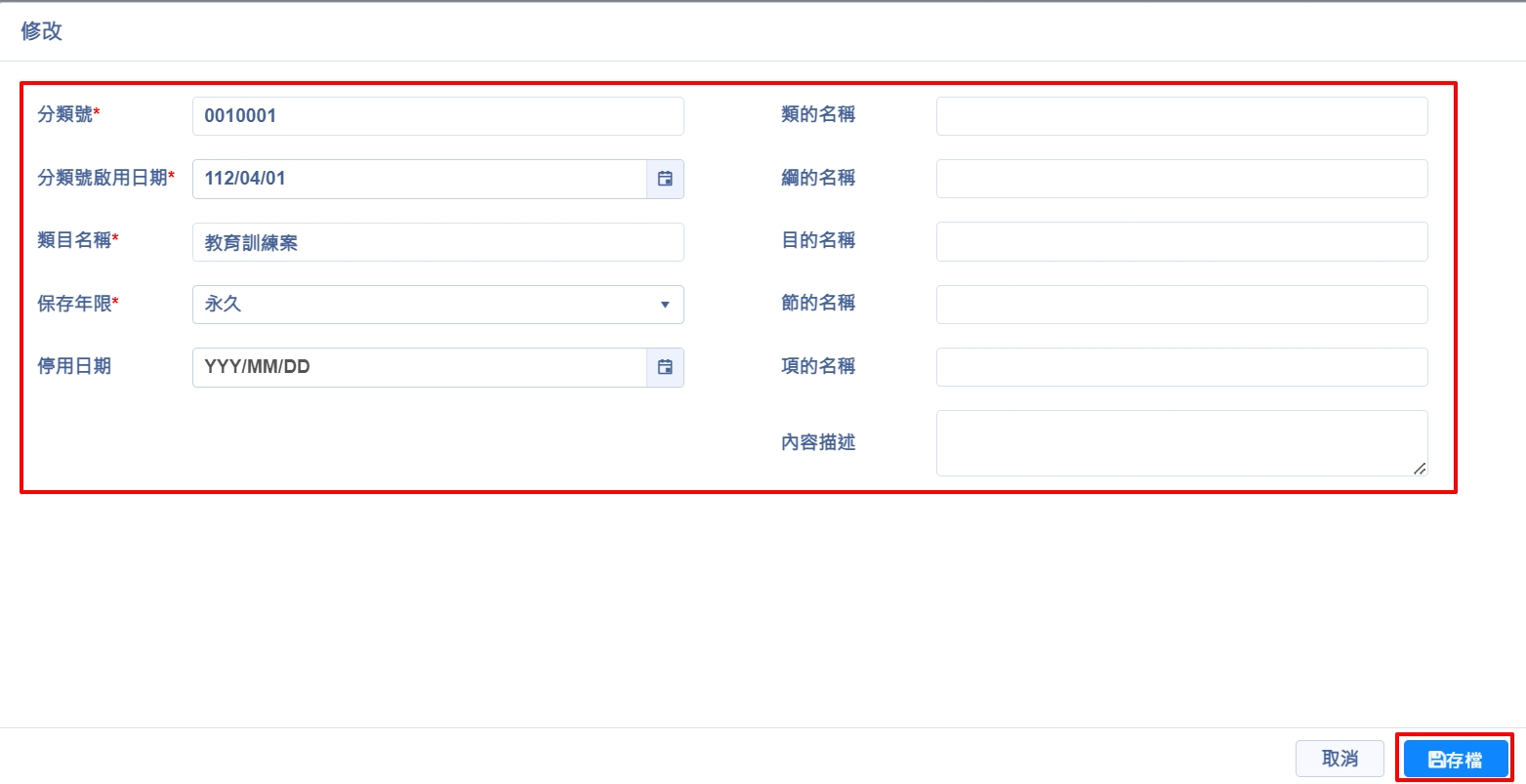 如果您在「分類號維護」中僅修改「保存年限」,這樣的變更會影響到已經使用該分類號的公文。如果您修改了其他的欄位(如分類名稱等),這些變更不會直接影響已經編目的公文。若您希望更新公文,需在編目系統中重新選擇修改後的分類號。