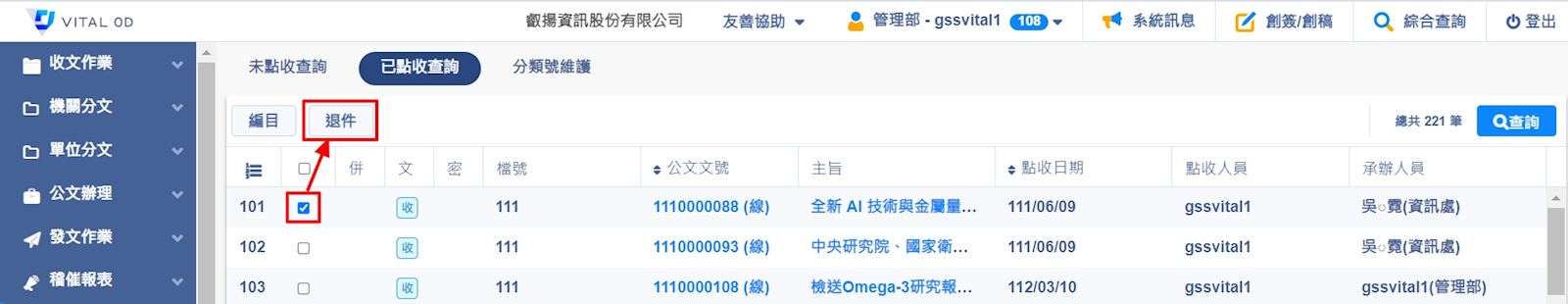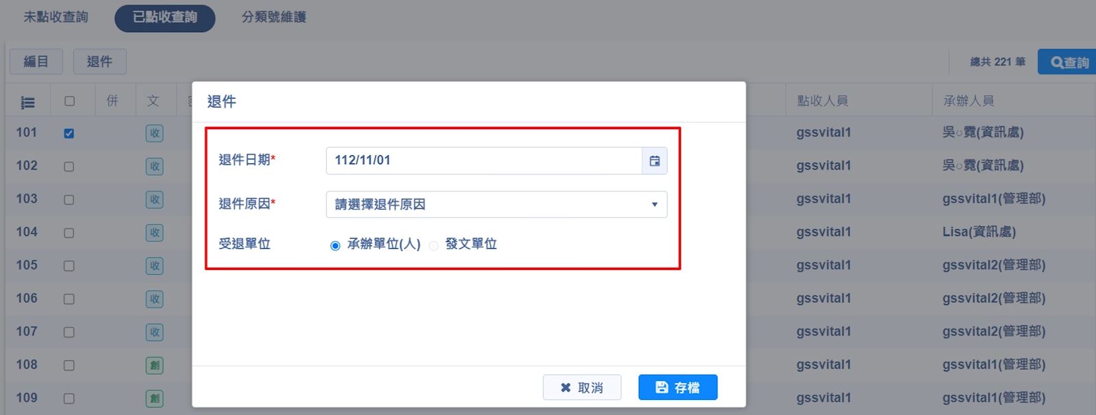 3. 在視窗中選擇退件原因、受退單位(退承辦或退發文)。