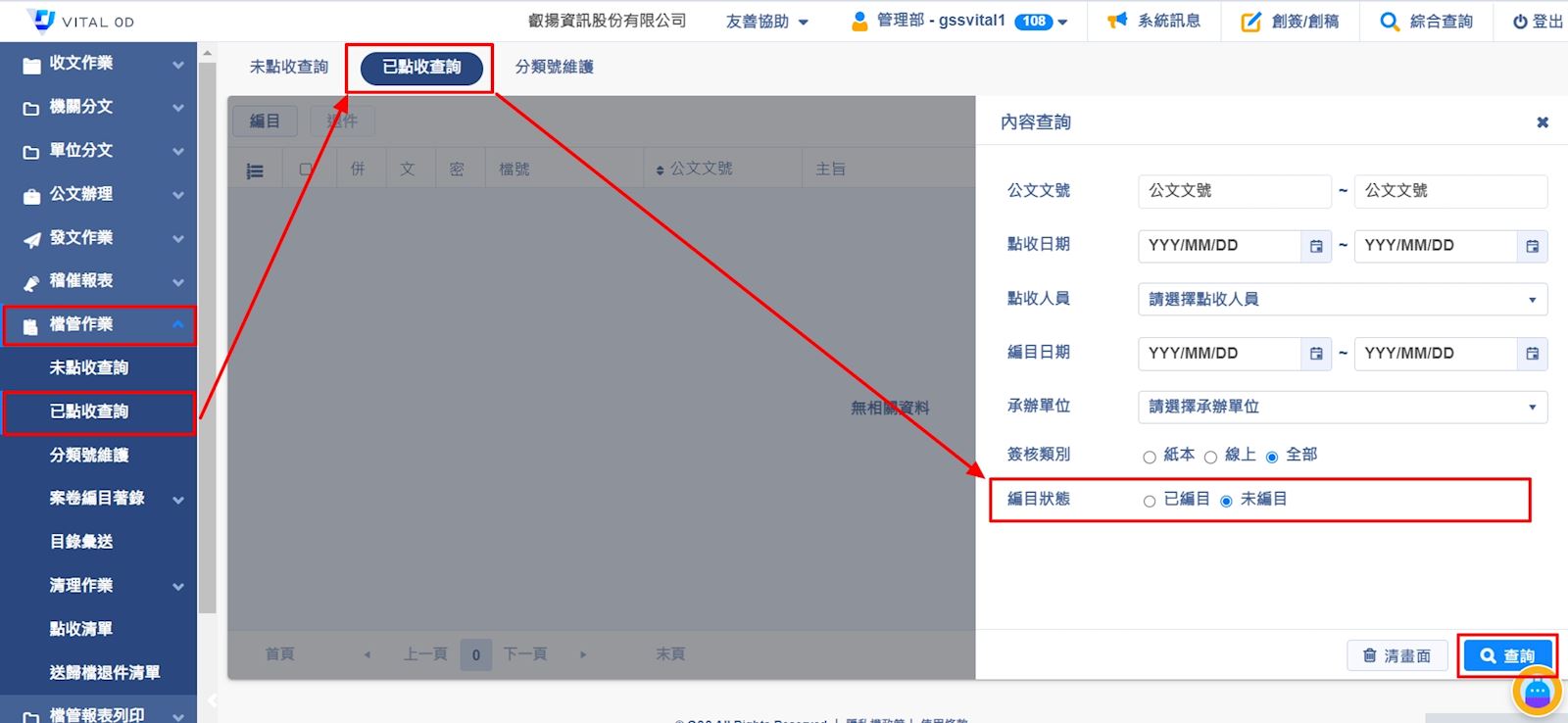 1. 進入【檔管作業>已點收查詢】,下查詢條件(依該公文已編目或未編目選擇編目狀態)。