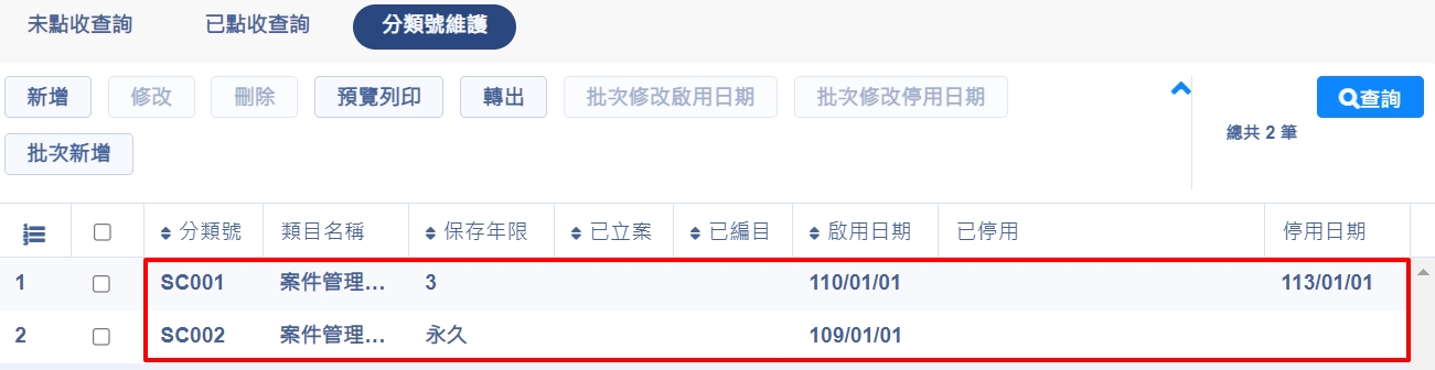 - 『啟用日期』、『停用日期』:請輸入分類號的啟用日期或停用日期,啟用日期為必填欄位,若無停用日期可不填入,日期格式範例:110/01/01