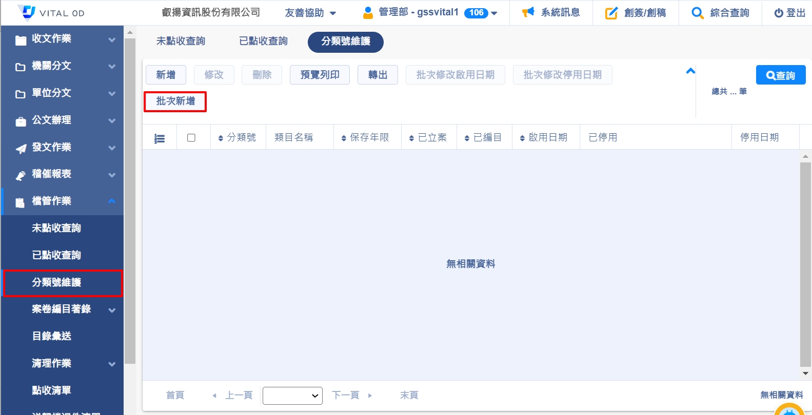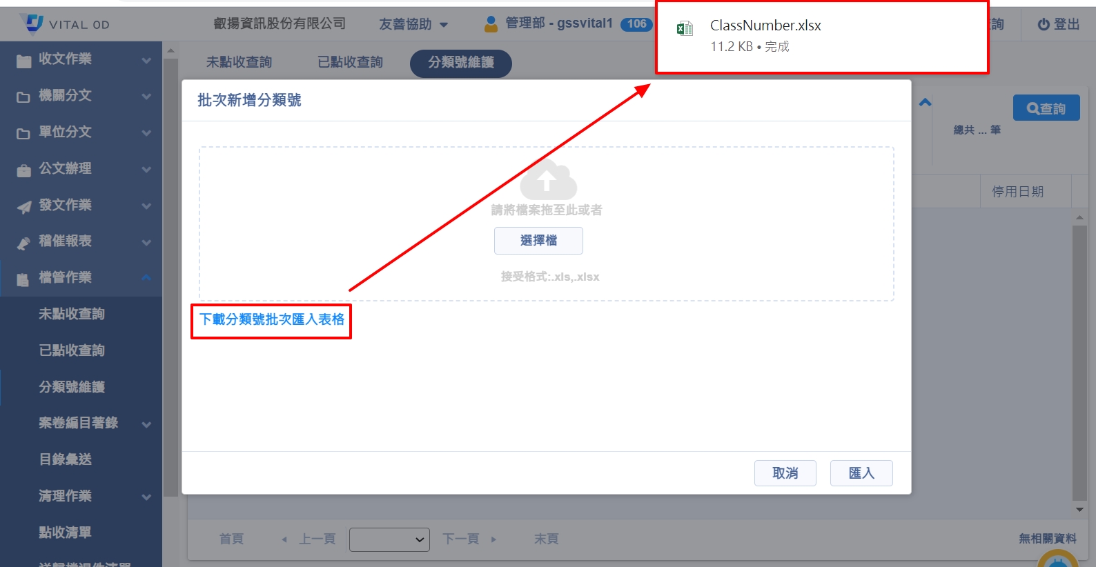 檔管人員可以透過批次新增的方式,下載匯入範本填寫後將分類號批次匯入建立,詳細操作說明如下: