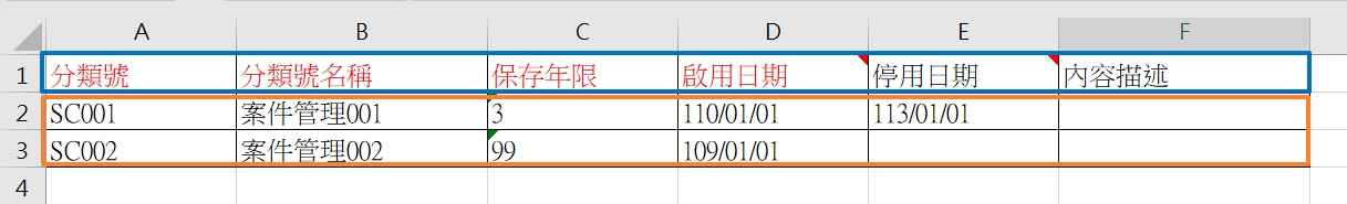開啟匯入表格後,即可編輯需要匯入的資料,表頭的部分為『分類號』、『分類號名稱』、『保存年限』、『啟用日期』、『停用日期』、『內容描述』(如下圖藍框處)