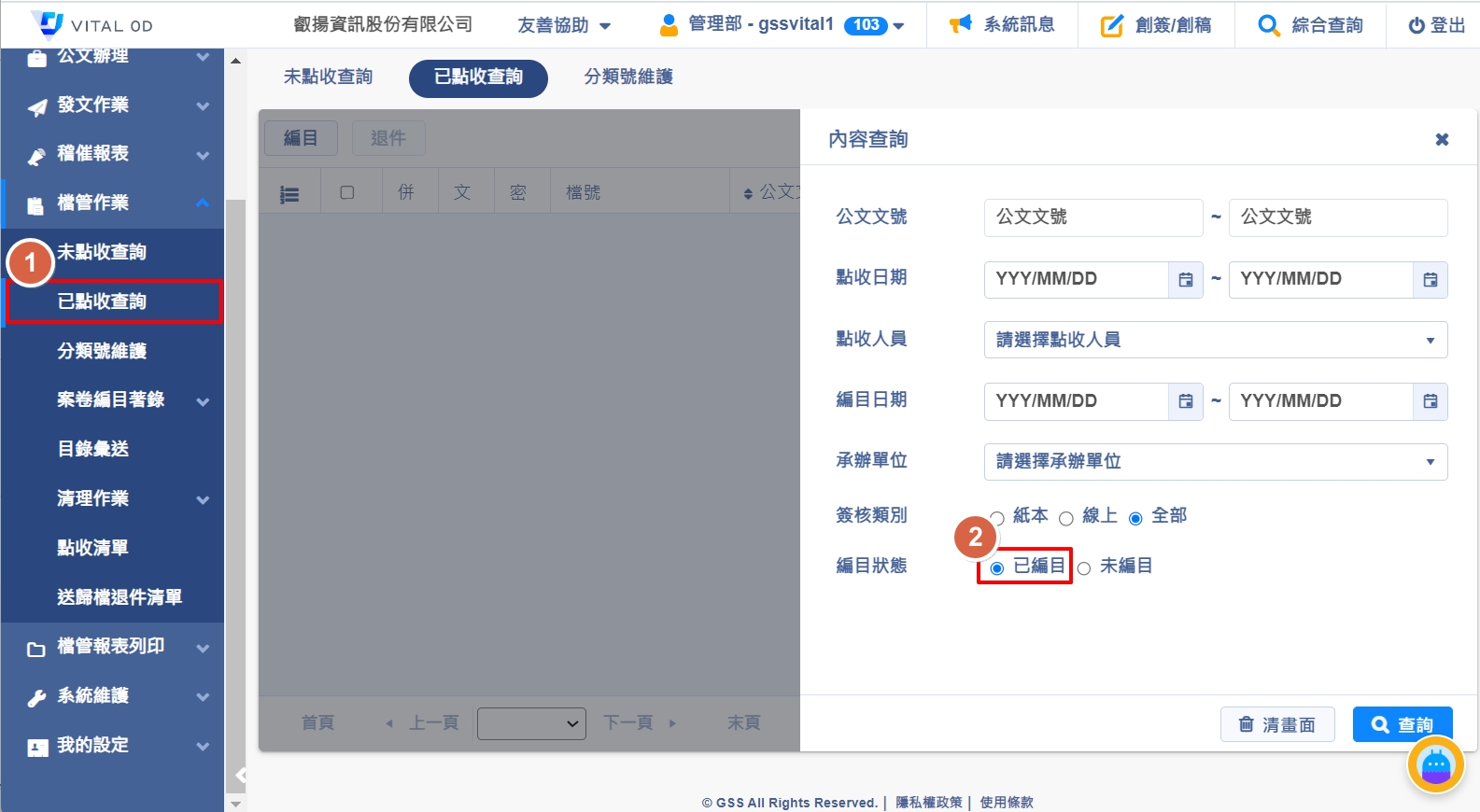 檔管人員可以在【檔管作業>已點收查詢】調整搜尋條件為「已編目」。
