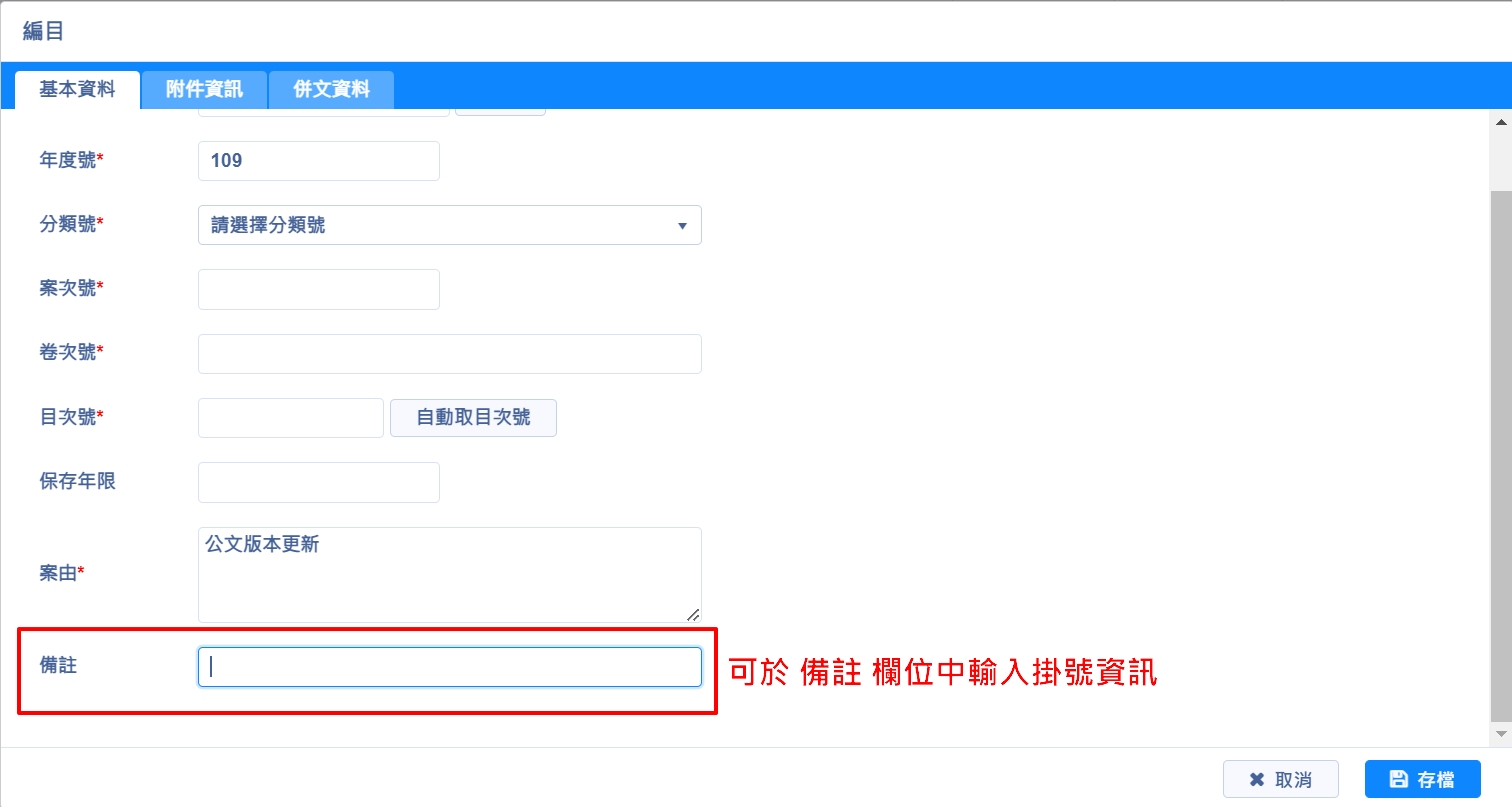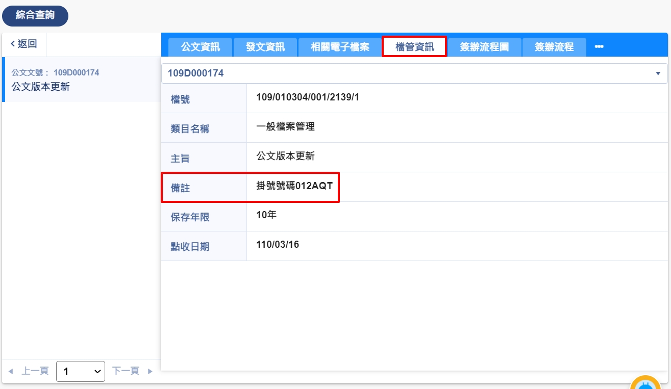 可於【綜合查詢】中查到該公文,並點擊【主旨>檔管資訊】,即可查到原先編目時註記的備註欄位。
