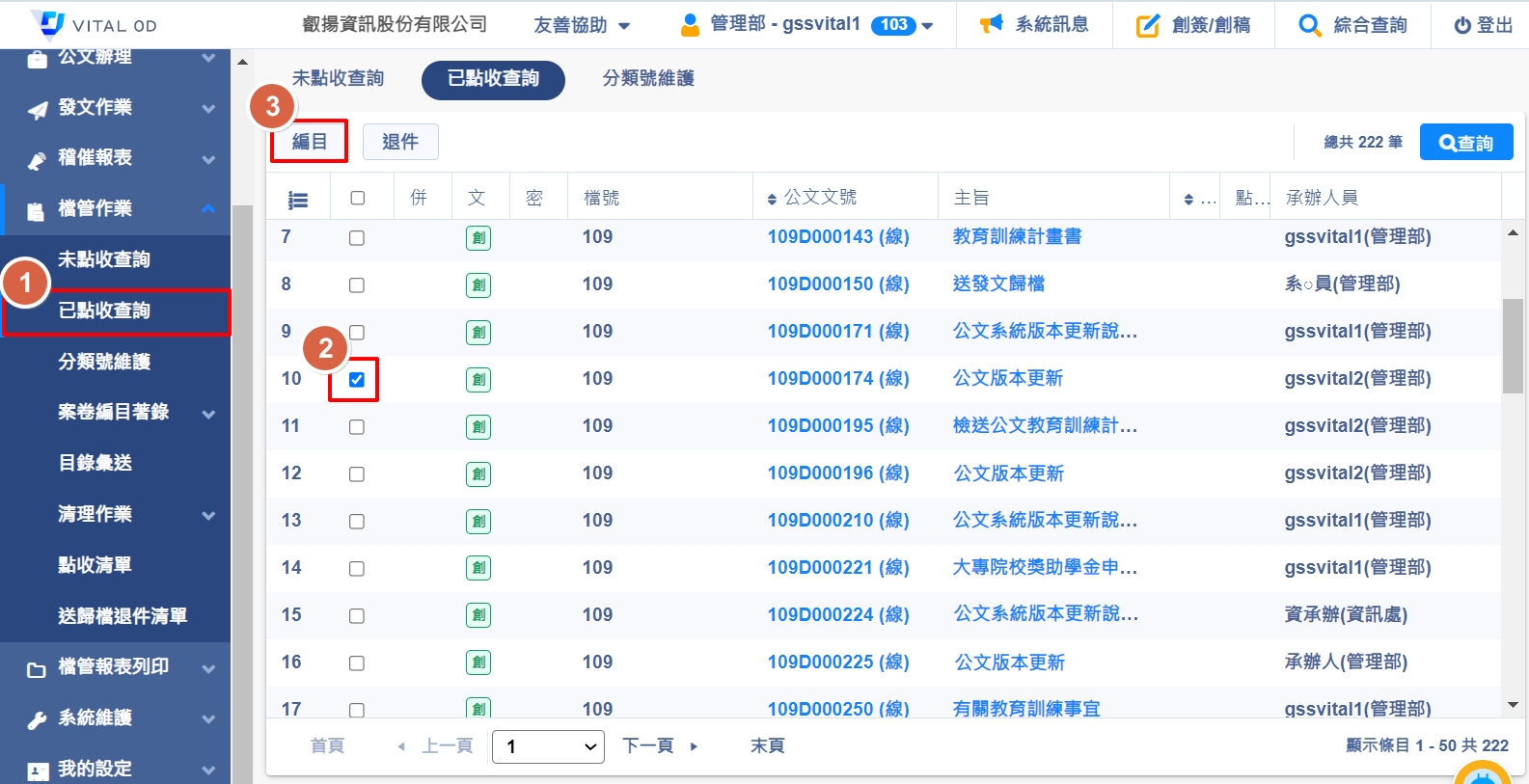 1. 點擊【檔管作業>已點收查詢】,勾選公文後,點擊上方的「編目」。