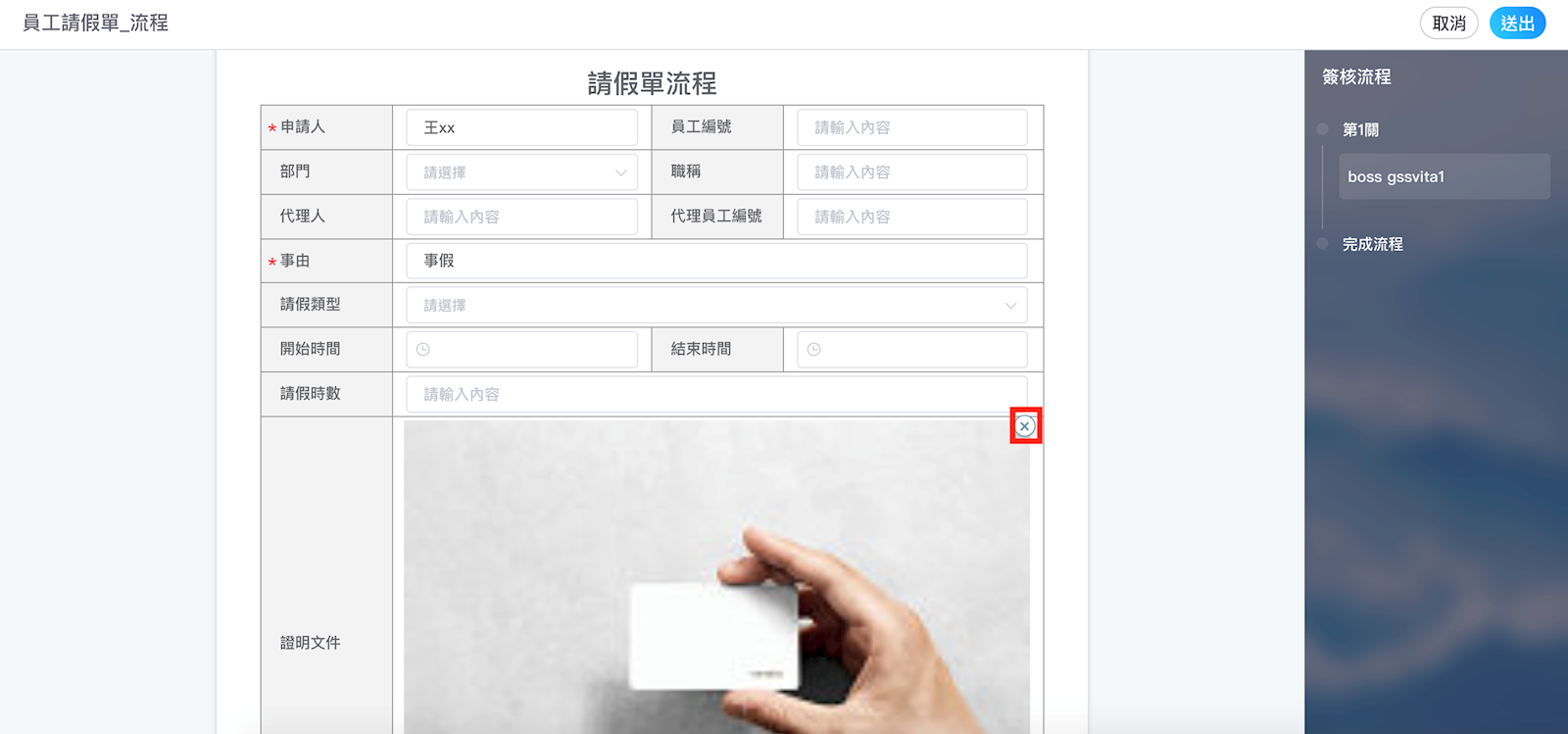 而填單者就會看到預覽圖片,若填單著要重新上傳圖片,點選圖片右上角的【 X 】即可重新上傳。