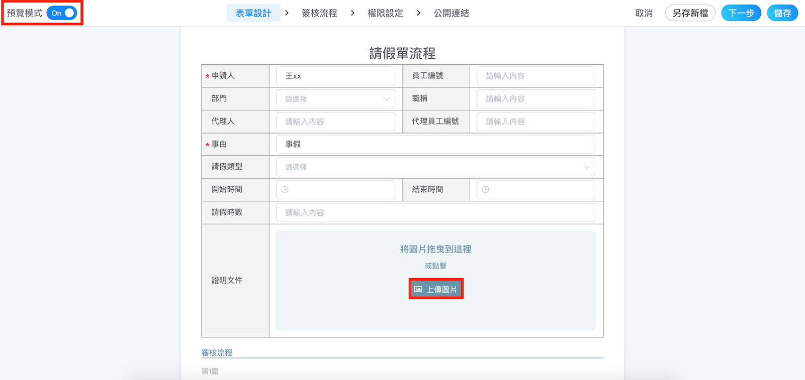 若要上傳預覽圖片,您可以在設計表單時,開啟左上角的預覽模式,使用拖曳圖片或是上傳圖片的方式放上預覽圖片。