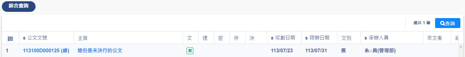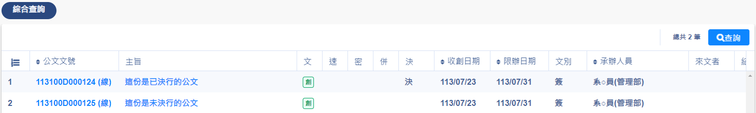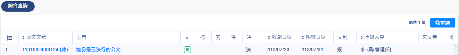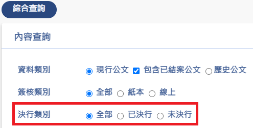 綜合查詢可使用「決行類別」,分為「全部」、「已決行」、「未決行」來區分查詢。