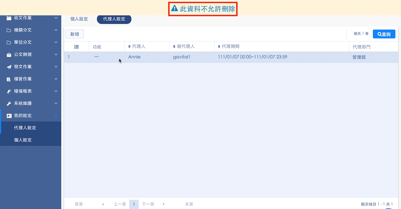 為何欲將代理人刪除,卻顯示「資料不允許刪除」,如下圖所示: