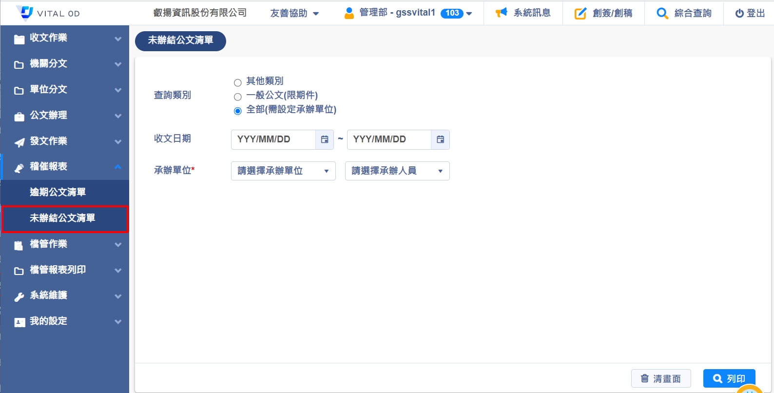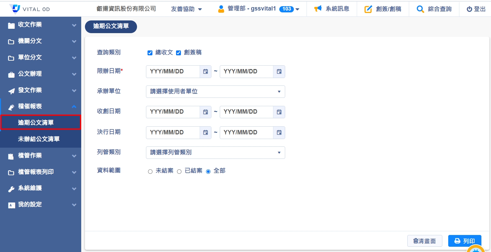 欲查詢「逾期公文」或「未辦結公文」,可於【稽催報表】中輸入條件產出報表。