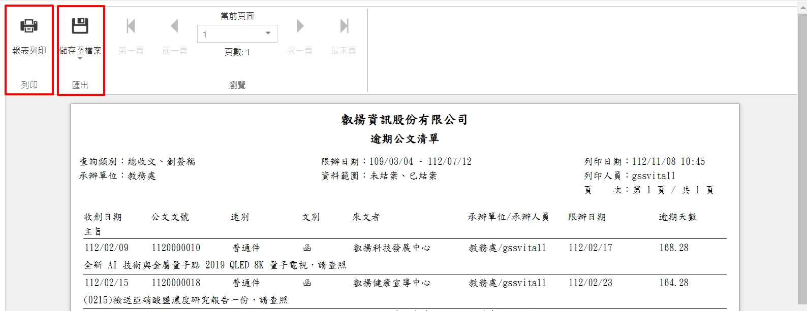 輸入查詢條件後,點擊右下角【列印】,系統會另開視窗顯示出清單報表。