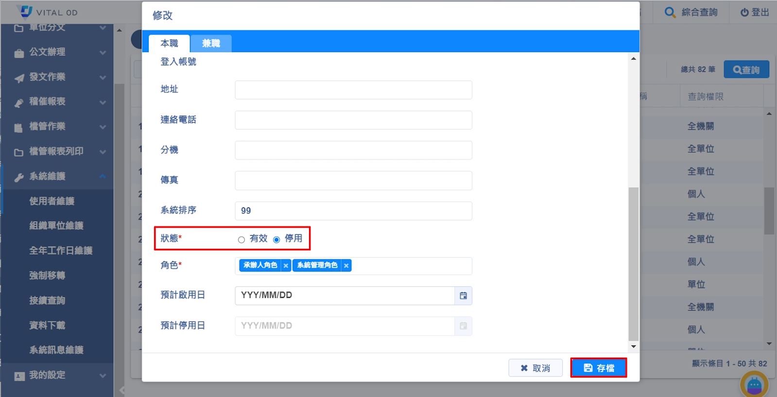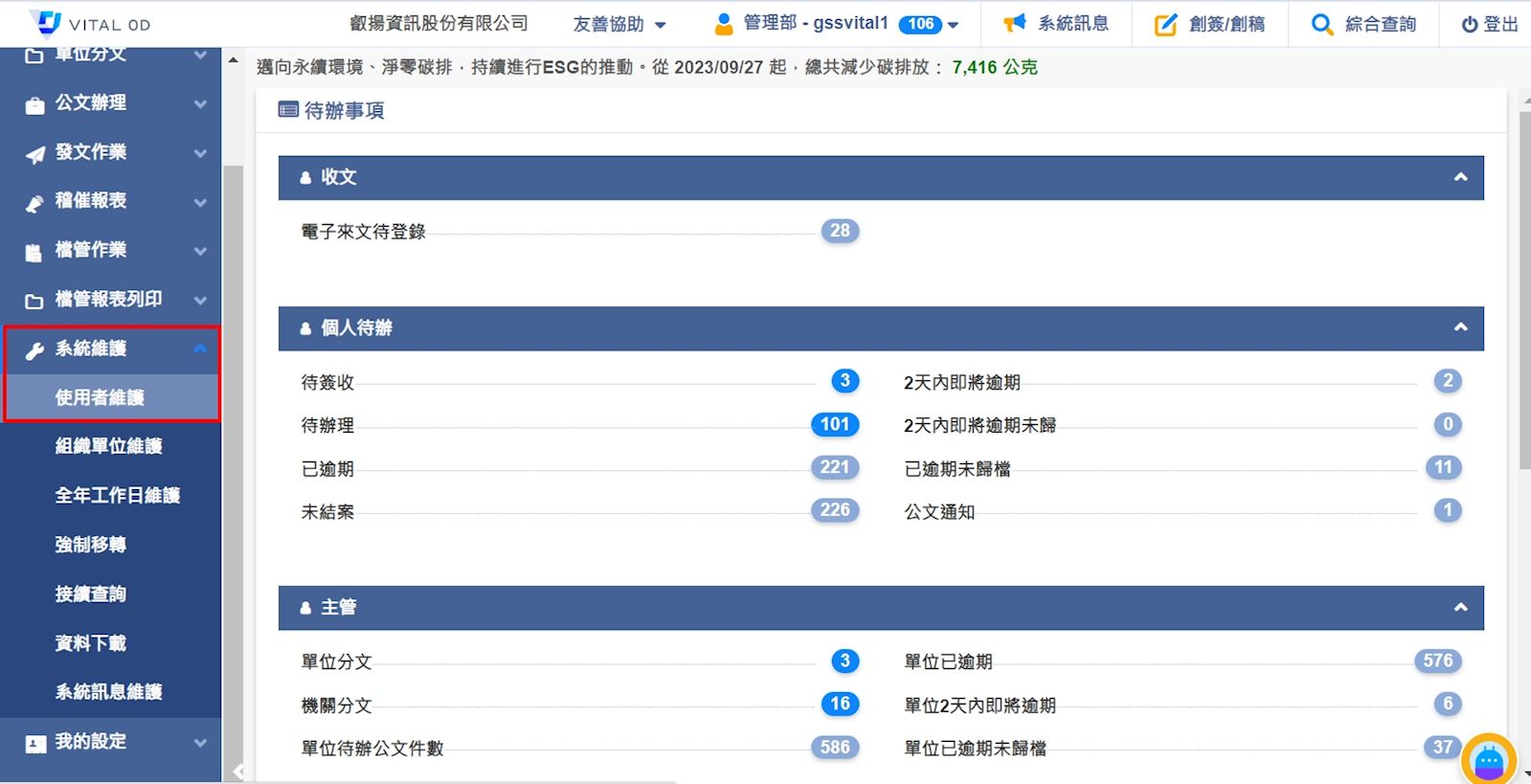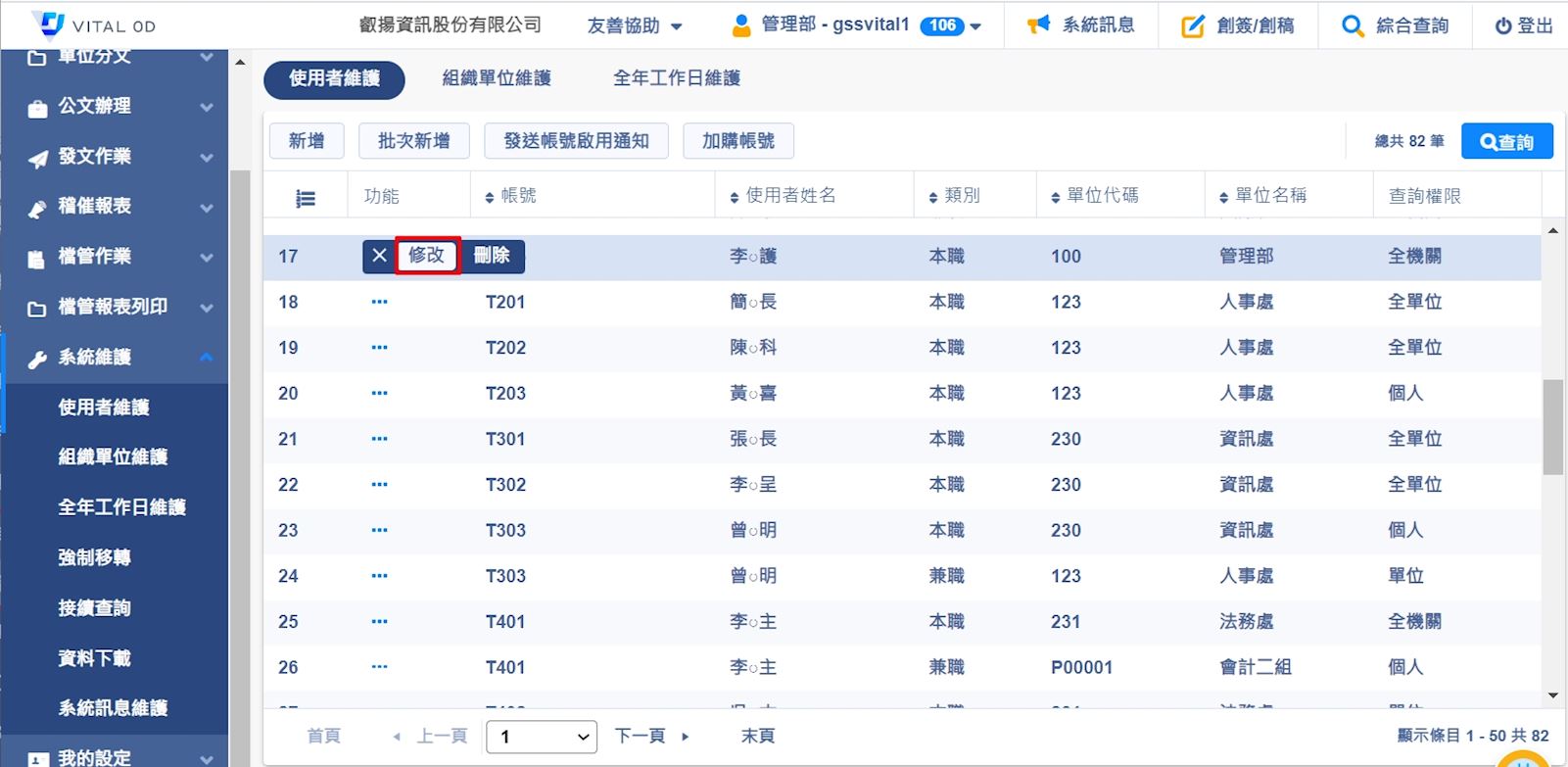 如果人員離職,或是想要更換登入的帳號,請系統管理員於【系統維護>使用者維護】