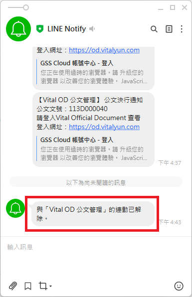 解除綁定後,LINE Notify也會收到連動已解除的訊息。