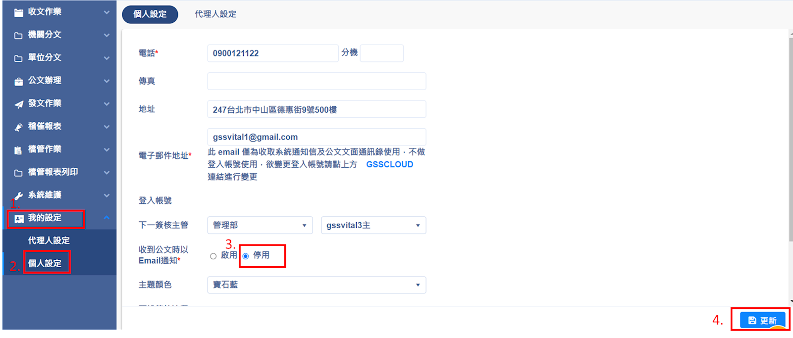 但為了有效的稽催公文,當您停用e-mail通知後,承辦人還是可以收到稽催信件,其餘通知信都不會收到。
