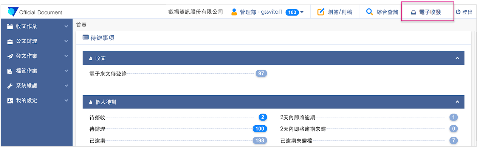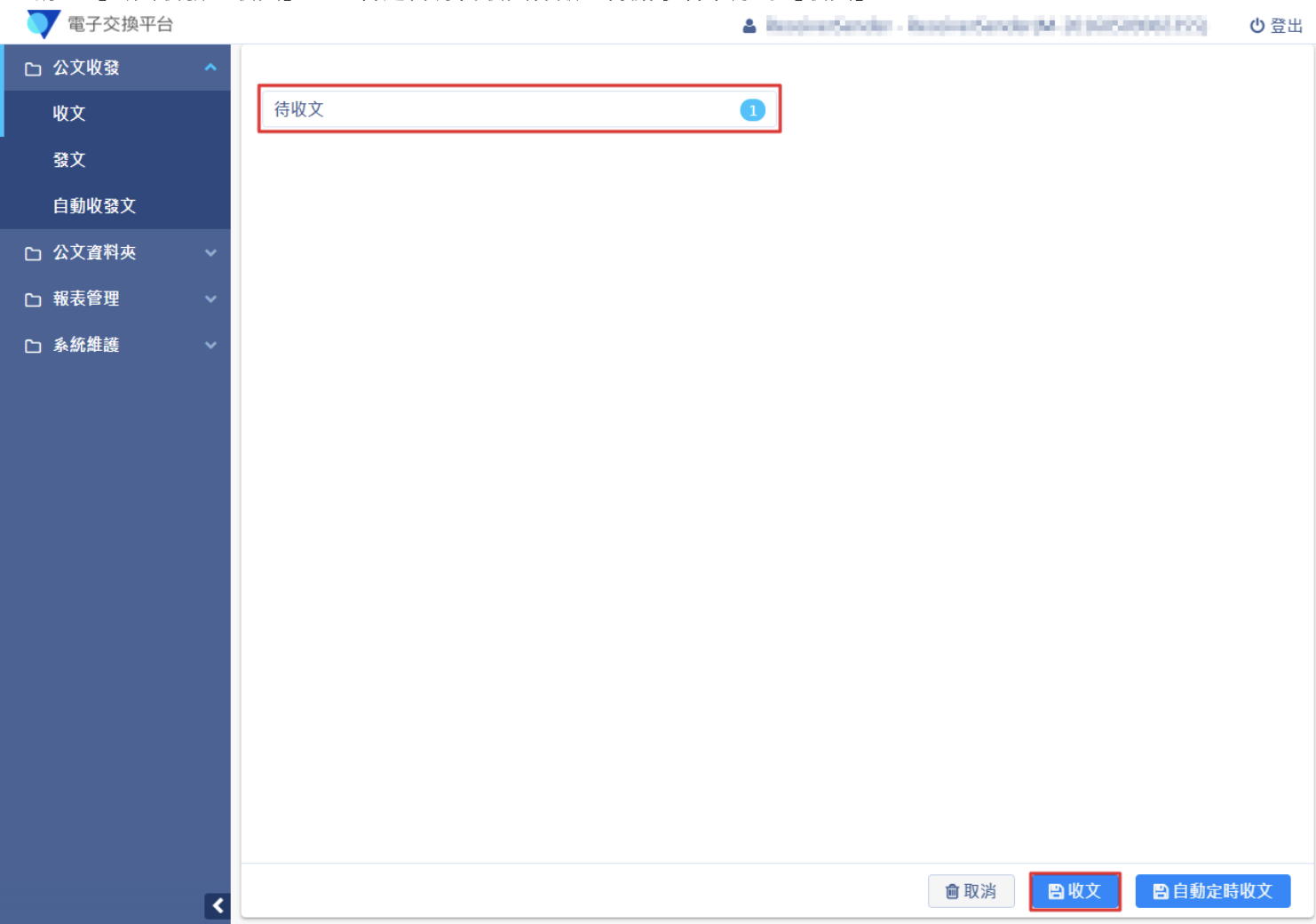 1. 登入系統後,請點選右上角【電子收發】進入電子交換平台。
