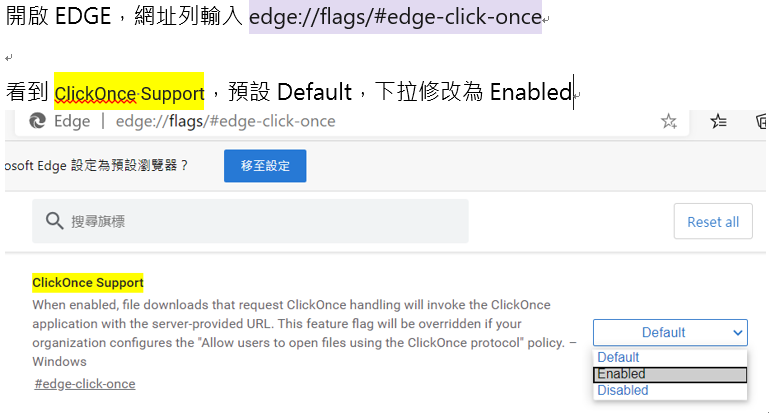 → 需要 ClickOnce 支援的使用者可以移至 edge://flags/#edge-click-once 並從下拉式清單中選取「啟用」。 您必須重新啟動瀏覽器。