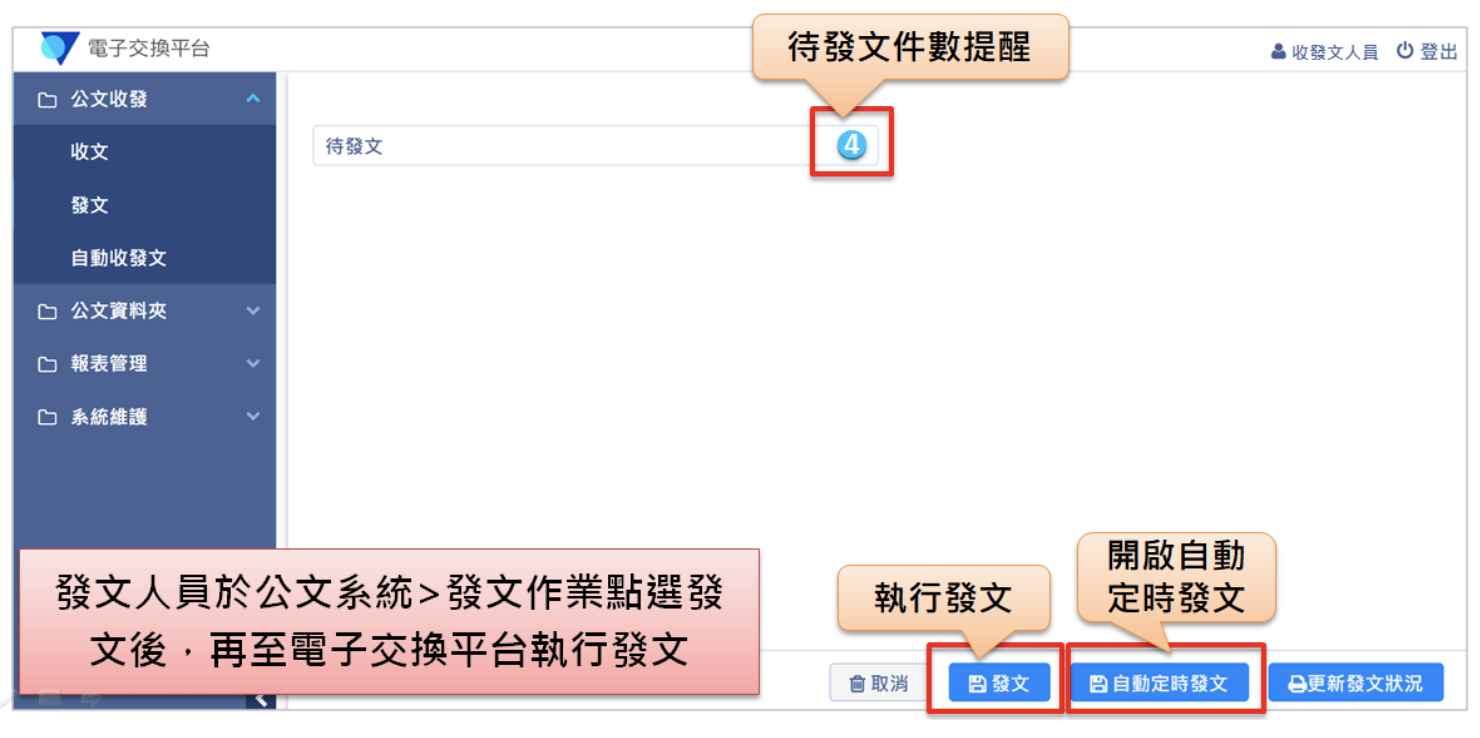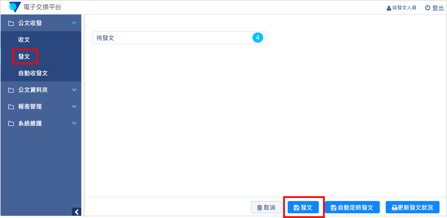 2. 請至電子交換平台,由【公文收發>發文】進入,點擊右下方的【發文】按鈕。(請注意,發文處理時,請勿關閉電子交換平台的分頁)