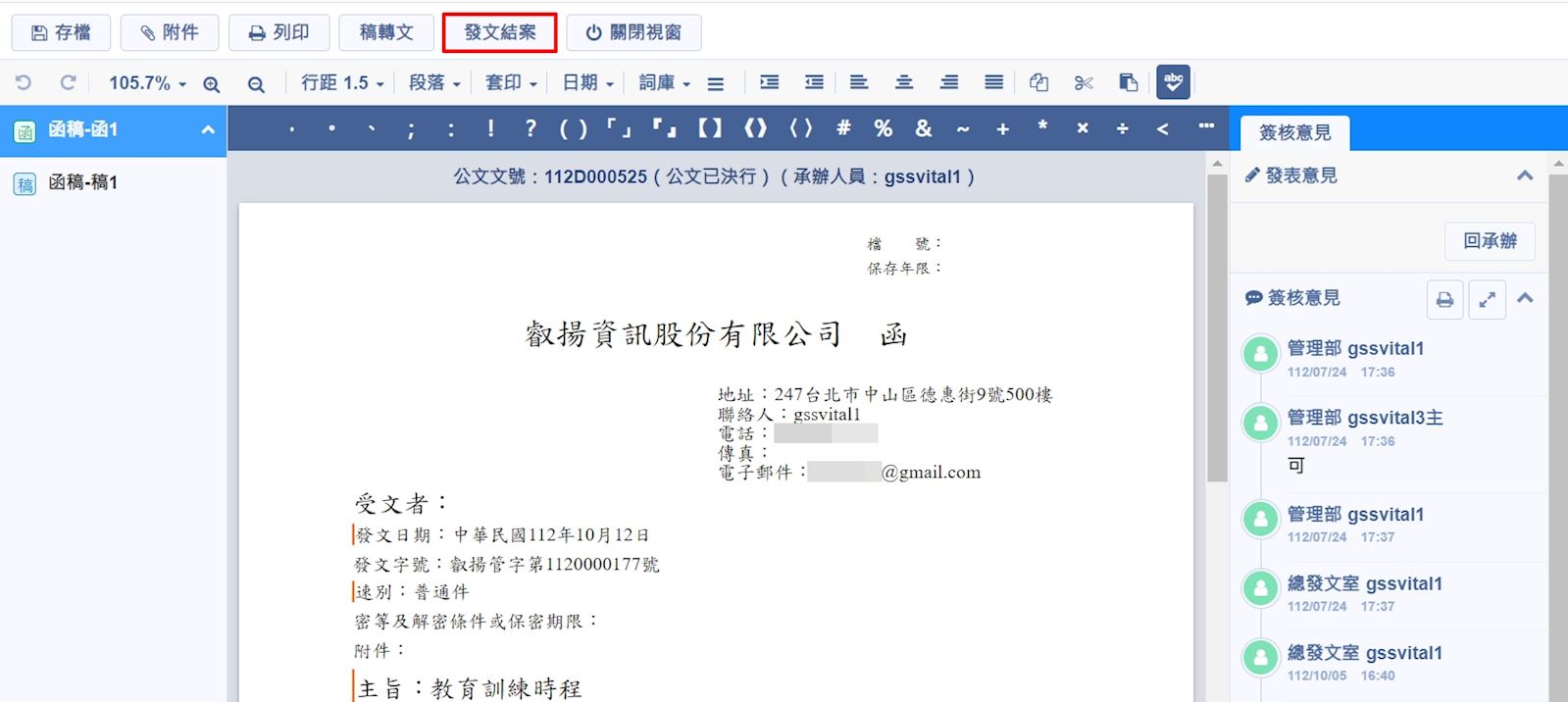 1. 請於公文系統中的【發文作業>待發文】打開公文後點擊畫面上方的【發文結案】按鈕,接著請關閉此公文分頁