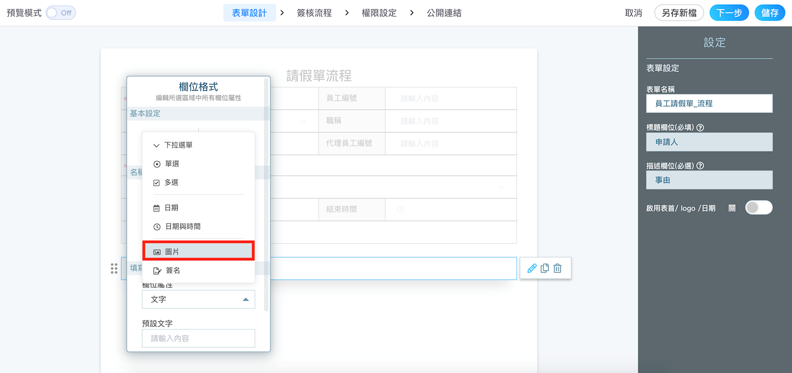 請在設計表單時,新增一個欄位,並將欄位屬性選擇為「圖片」。