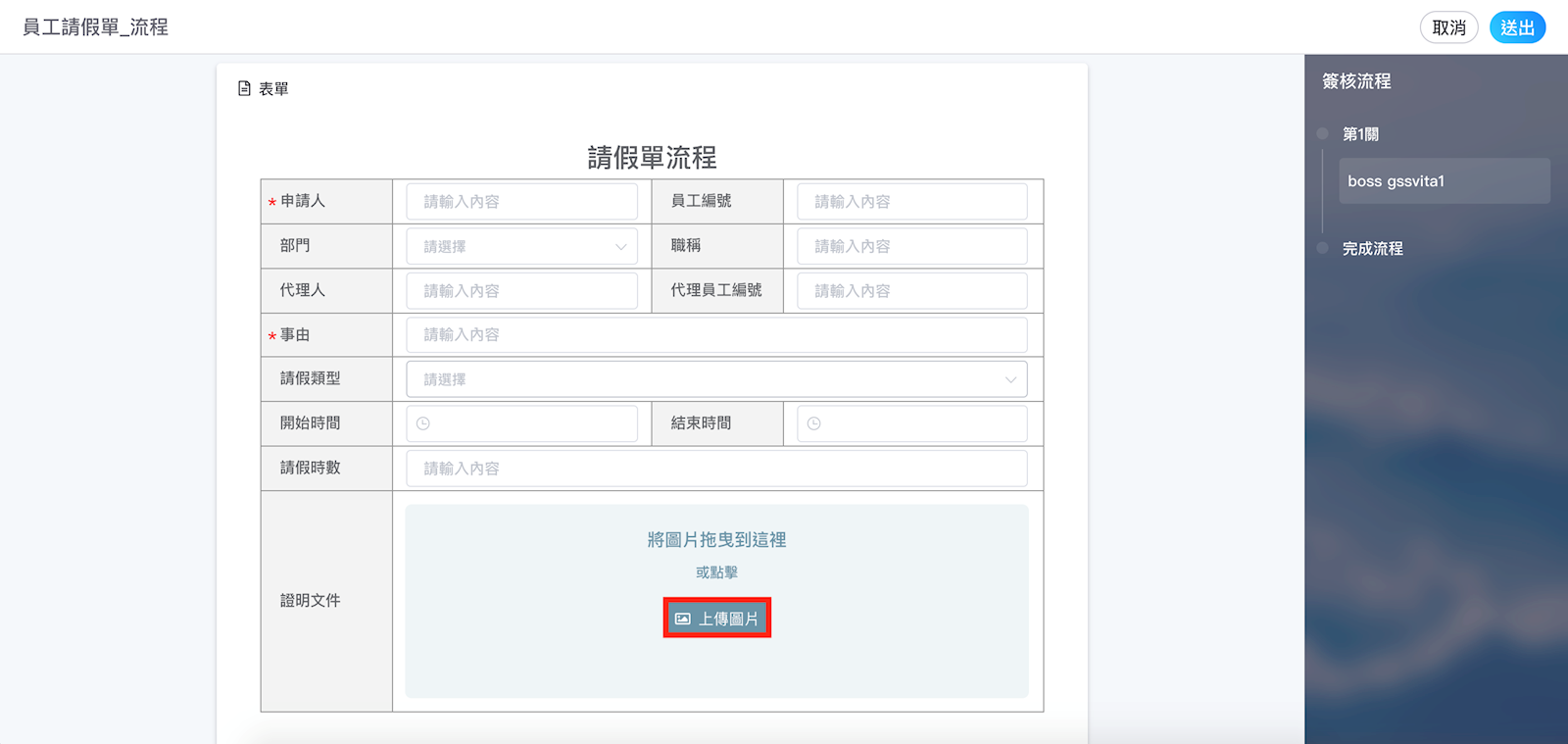 如此一來,填單者即可在表單中上傳圖片,可將圖片拖曳到輸入框中,也可點擊「上傳圖片」按鈕選擇檔案。