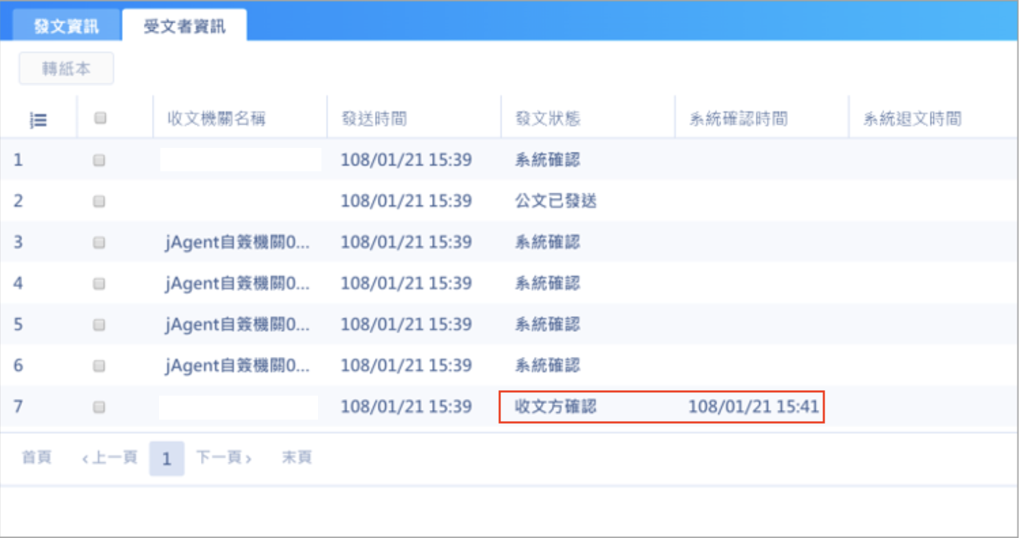請至【交換平台>公文資料夾>發文查詢】中,點選文號後查看受文者資料,如顯示「收文方確認」並有確認時間,代表對方已確認收文。