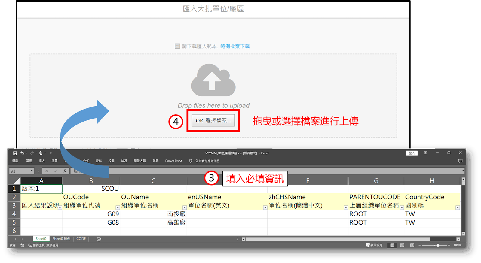 使用者可以下載範例檔案後,按照範例檔案內的欄位格式進行填寫,將想要新增的「組織單位代號」、「組織單位名稱」、「上層組織單位名稱」以及「國別碼」填寫完成,即可一次新增多個廠區資料,如下圖所示。.png)