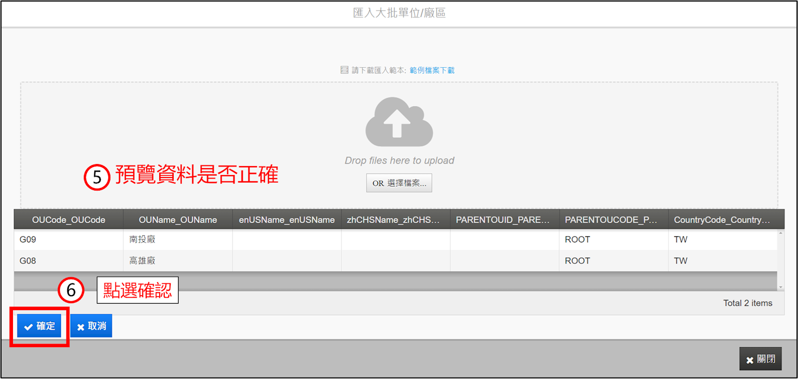 上傳完成後,系統會顯示剛剛上傳的檔案內的資料,使用者可以預覽確認一下是否正確,如果沒有問題的話,就可以點選左下角的「確定」進行上傳,如下圖所示。.png)