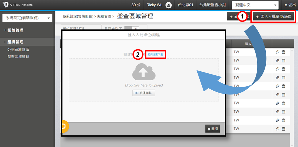 使用者如果有多個廠區需要建立在系統上,必須擁有管理者的權限角色(下一章節說明權限設定),可以選擇個別新增廠區或是透過Excel檔案上傳檔案,一次新增多個廠區,如果使用者需要一次新增多個廠區的資料,點選「匯入大批單位/廠區」,接著就可以打開上傳檔案的頁面,如下圖所示。.png)