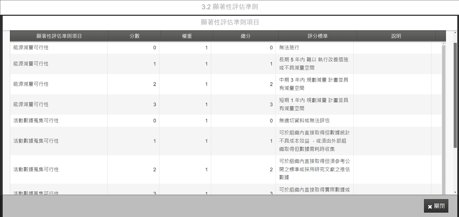 此處可編寫適合本次盤查報告進行的顯著性評估準則項目與量化評估的級分