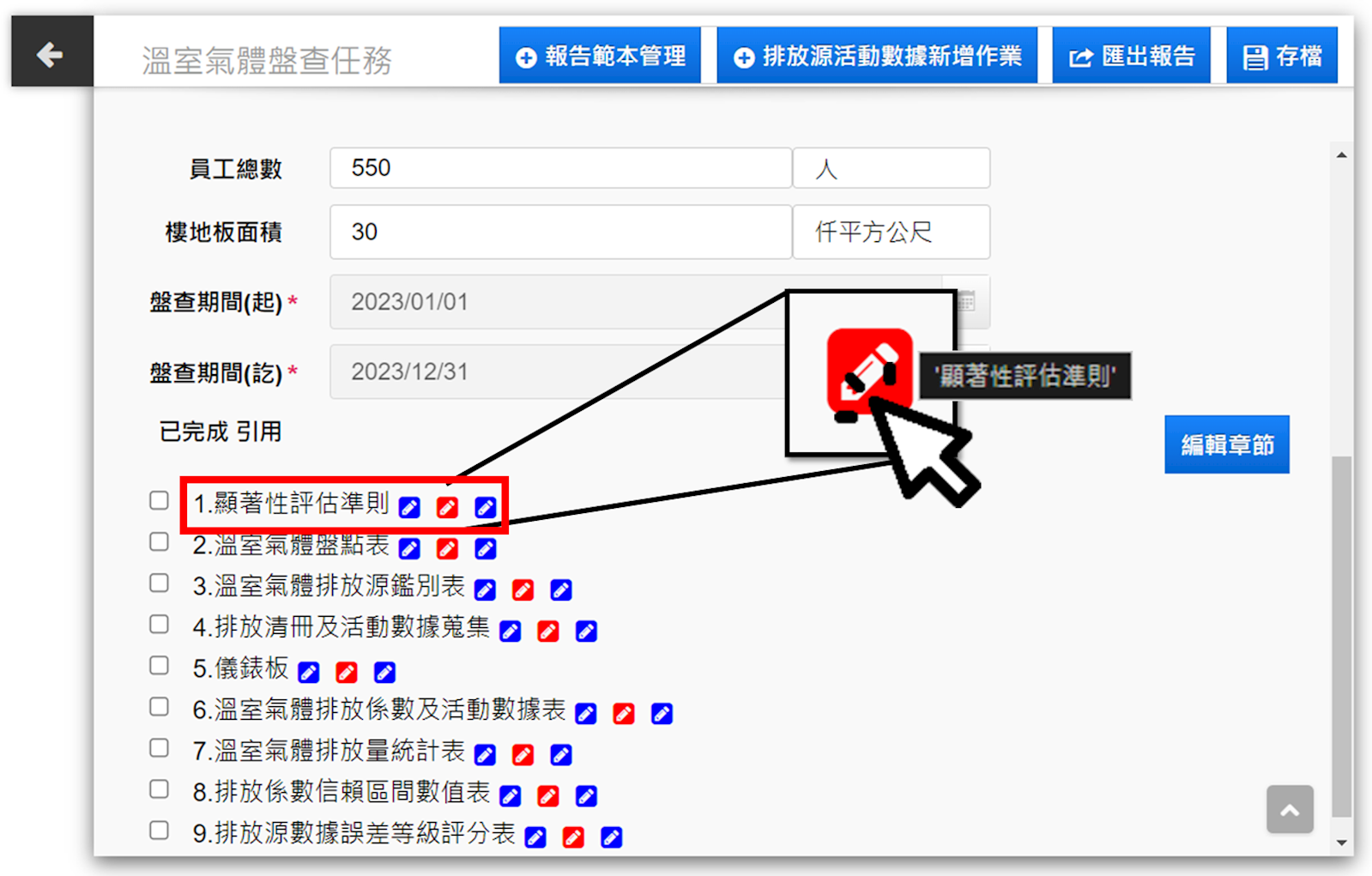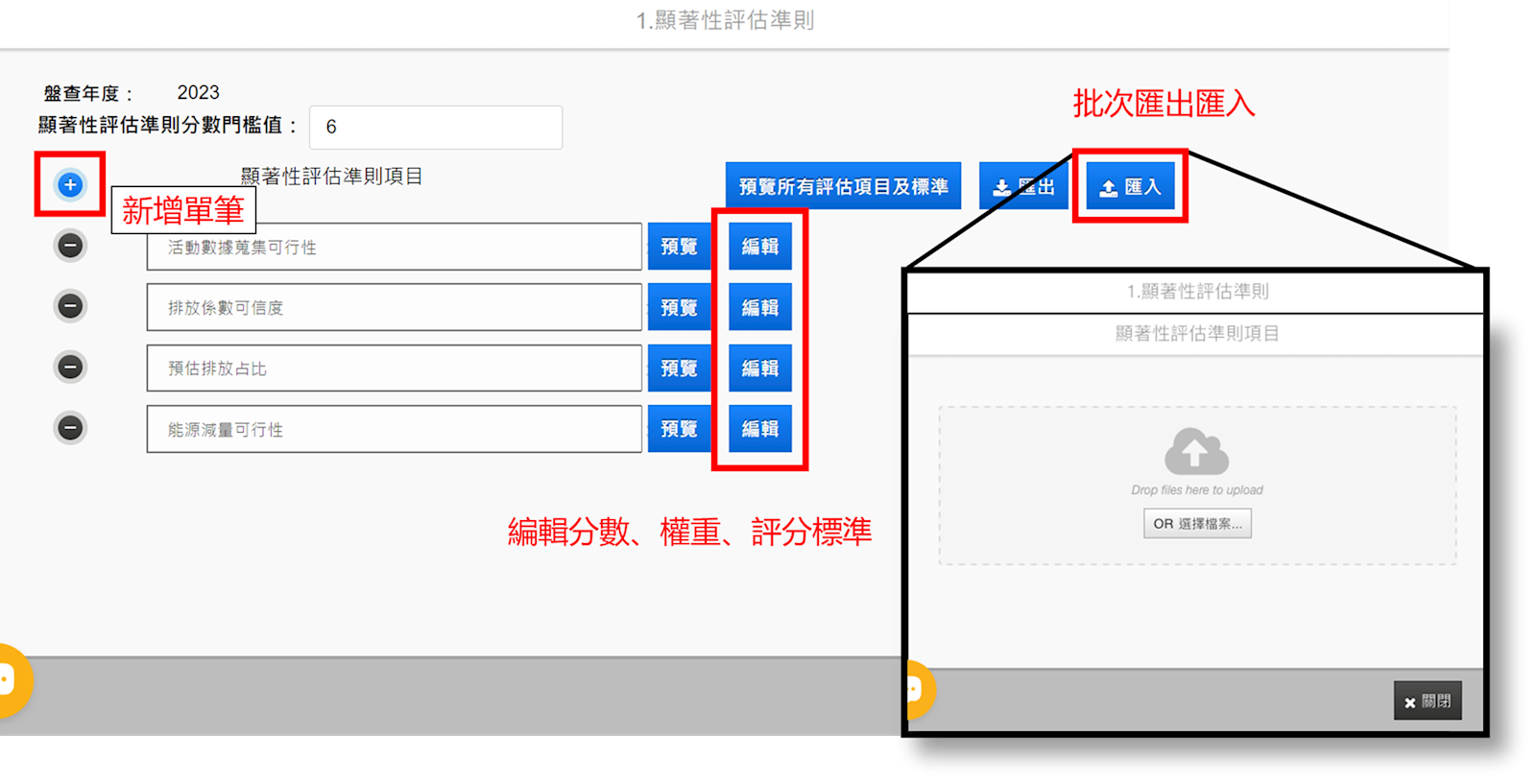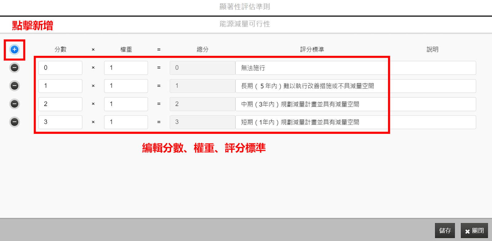 請點選顯著性評估準則章節旁的紅色 (鼠標會顯示顯著行評估準則),系統會出現顯著性評估準則項目與計分方式的編輯作業畫面,如下圖。