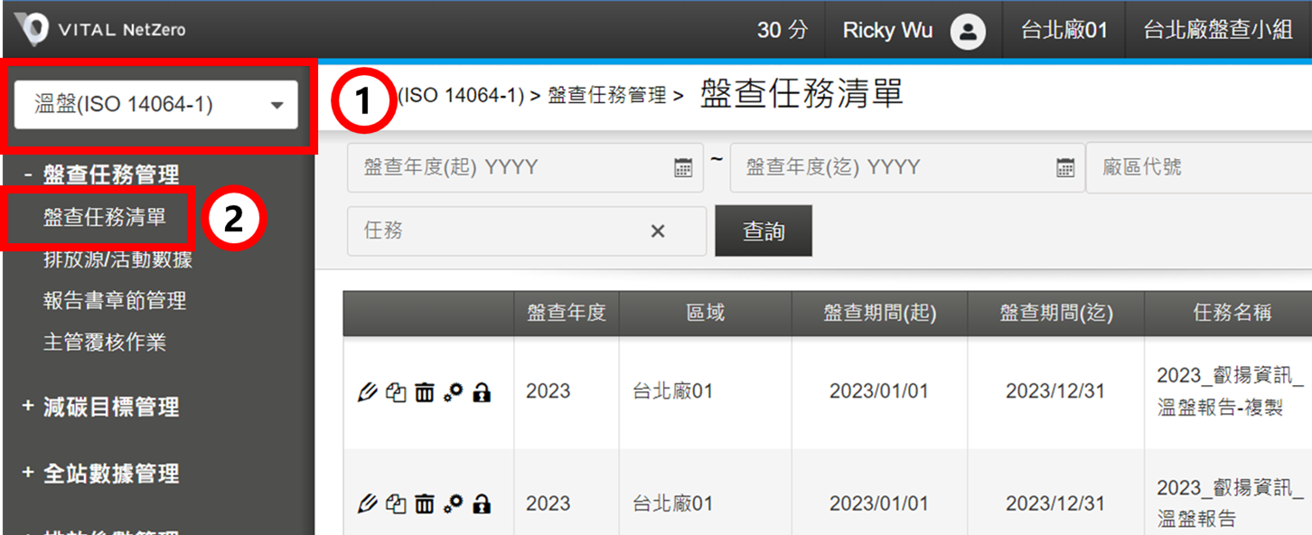 點擊左上角「全站功能」選單,選擇「溫盤(ISO 14064-1)」,點選「盤查任務管理」下方的「盤查任務清單」如下圖所示。
